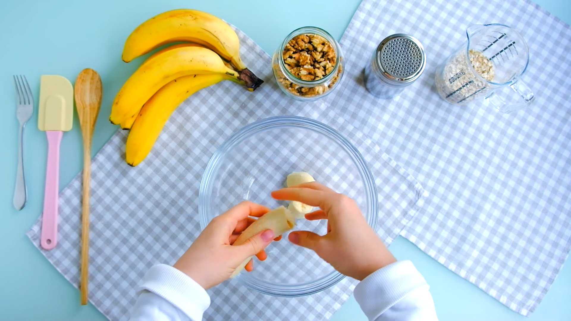 - Размять бананы в кашицу. Орехи измельчить до состояния крошки.