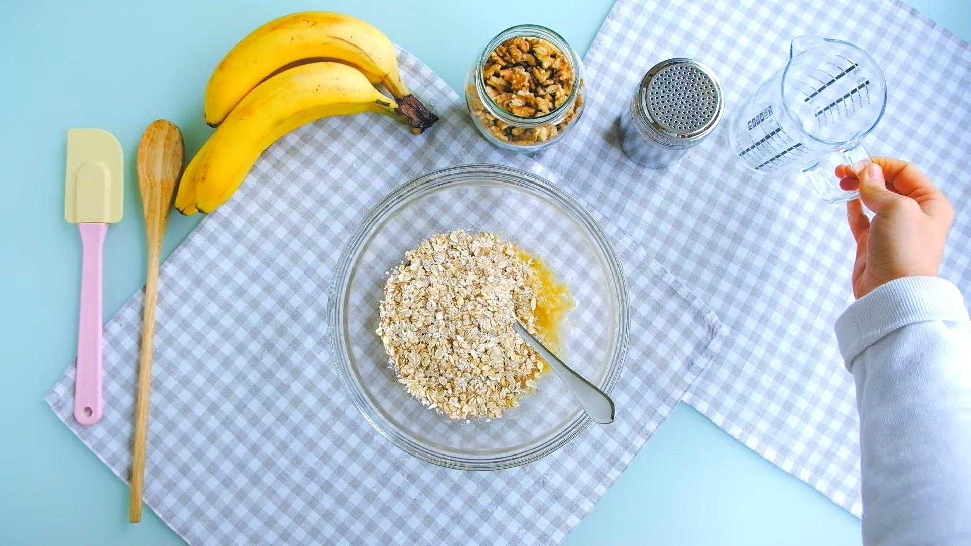 К банановому пюре добавляем овсяные хлопья и слегка размешиваем ингредиенты.