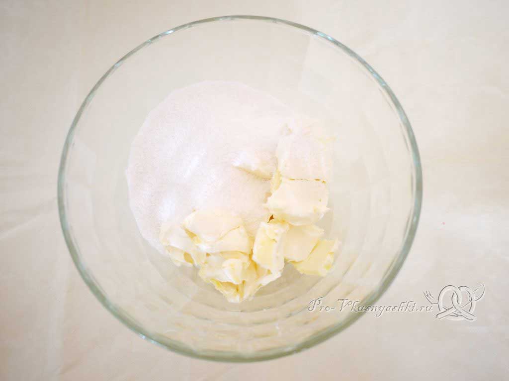 Масло или маргарин (180 г) мелко рубим и тщательно растираем с сахарной пудрой или сахаром (200 г).