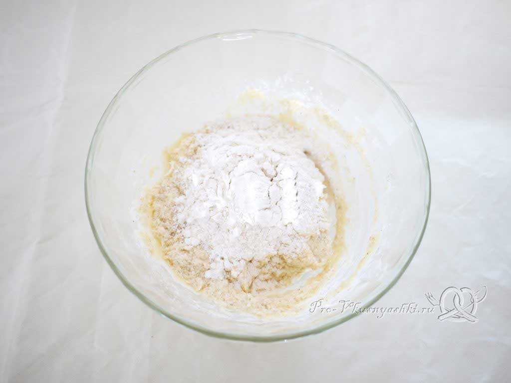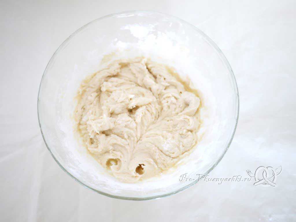 - Всыпать муку с разрыхлитель, превратить тесто в однородную массу. В итоге получится густое, тягучее тесто.