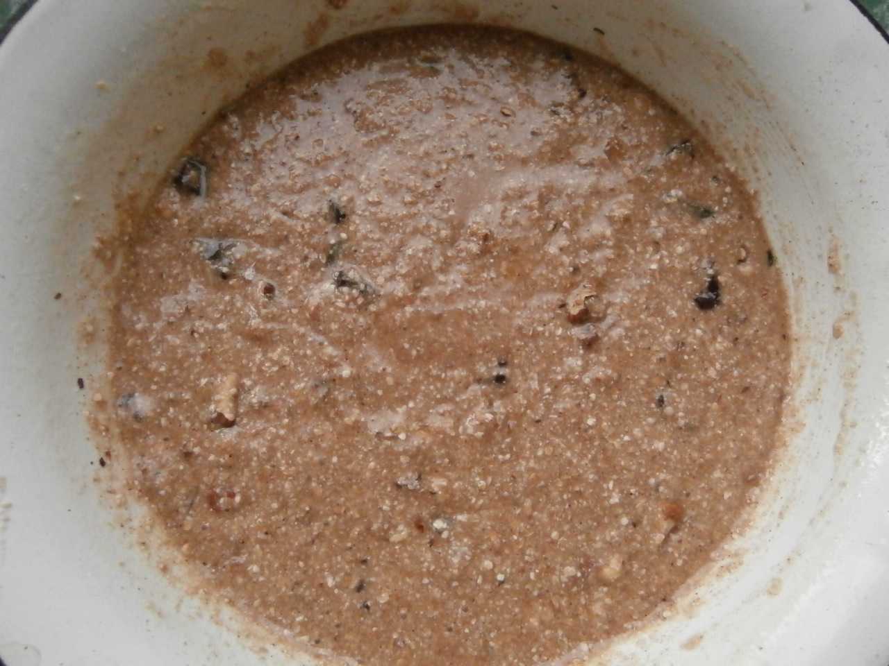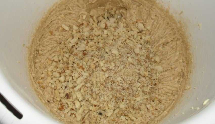 - Отправляем в полученную массу орехи (можно брать любые), ваниль, растворимый кофе, муку. Вымешиваем до однородности. Тесто должно быть, как очень густая сметана.