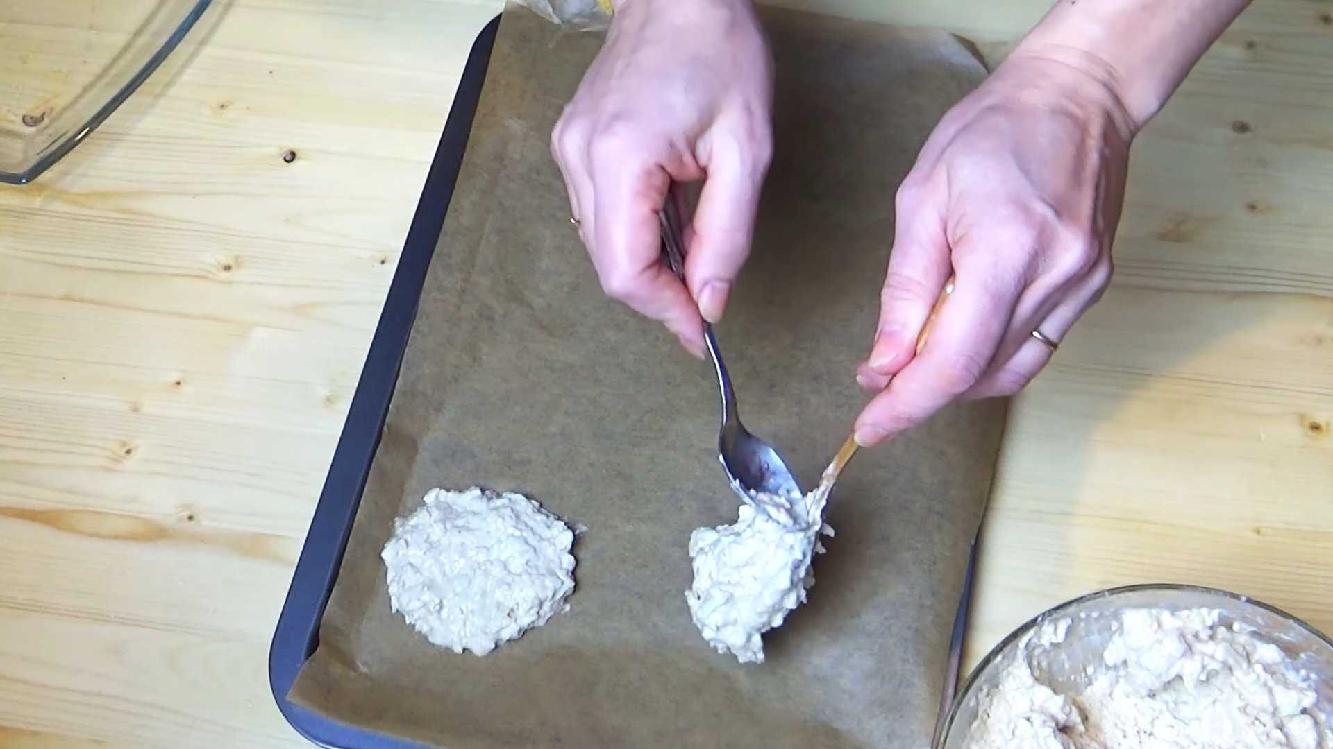 Шаг 7. Тесто выкладываем на пергаментную бумагу или смазанный растительным маслом противень при помощи ложки. Выпекаем 20-30 минут при температуре 160-1800.