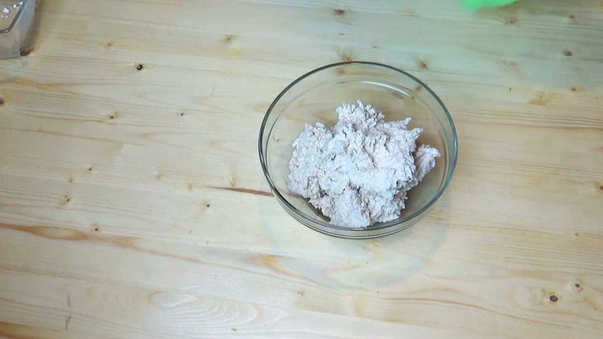 - Насыпьте необходимое количество пшеничной муки. Замесите руками крепкое тесто. Не добавляйте слишком много муки, иначе тесто будет густым.