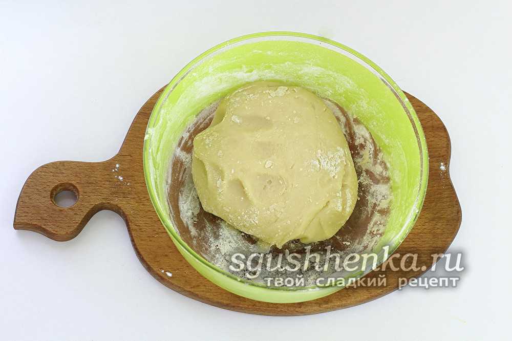 Выложить на посыпанную мукой поверхность и сформировать шар. Завернуть в полиэтилен и охладить 60 минут.
