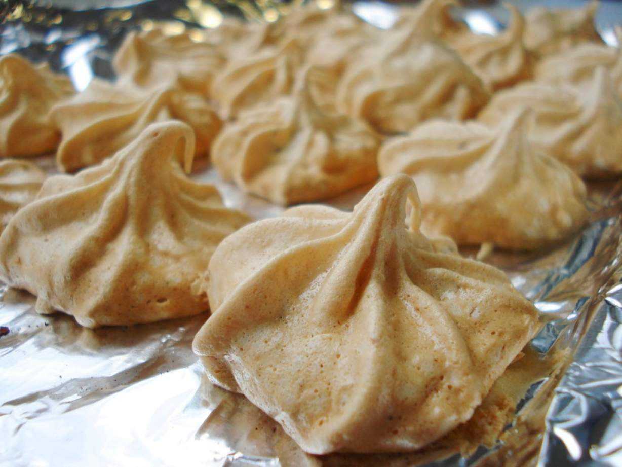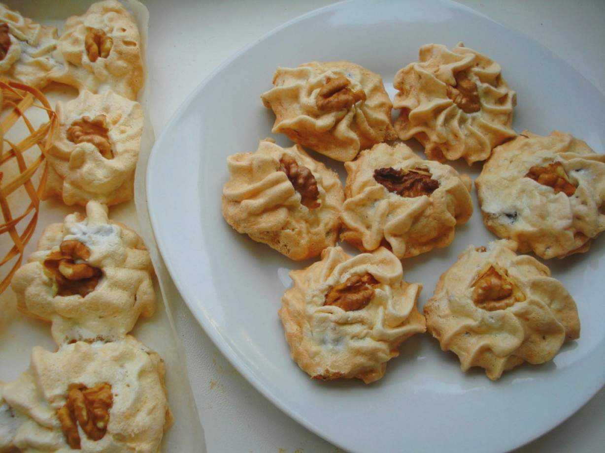 - Довольно густую орехово-белковую смесь выложить на противень, застеленный пекарской бумагой и посыпать сверху орешками и кусочками молочного шоколада. Температура выпекания должна быть не больше 100 градусов. Печься безе будут около часа. Затем их оставить в выключенной духовке еще на час.