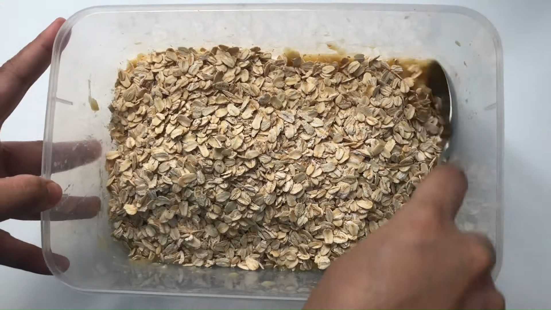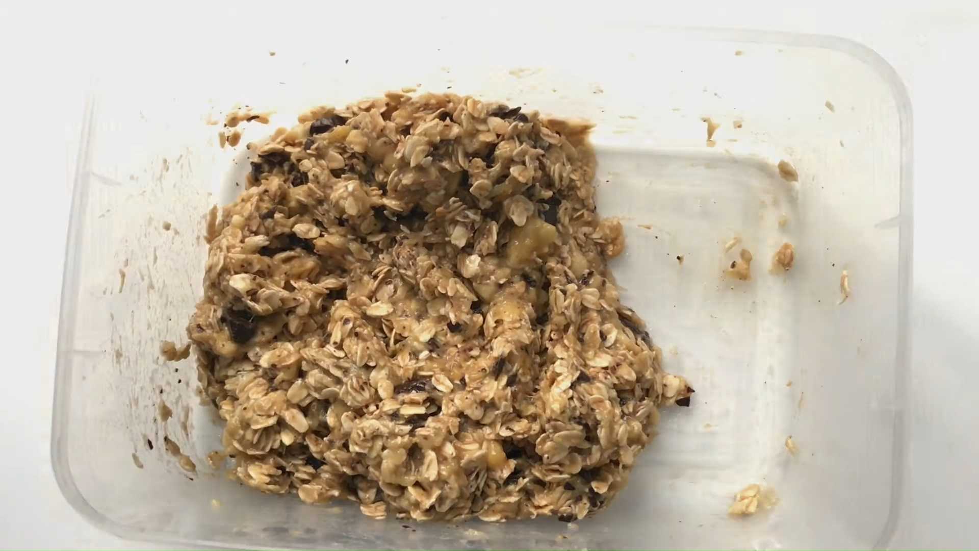 Высыпаем к банановому пюре овсяные хлопья. Перемешиваем.