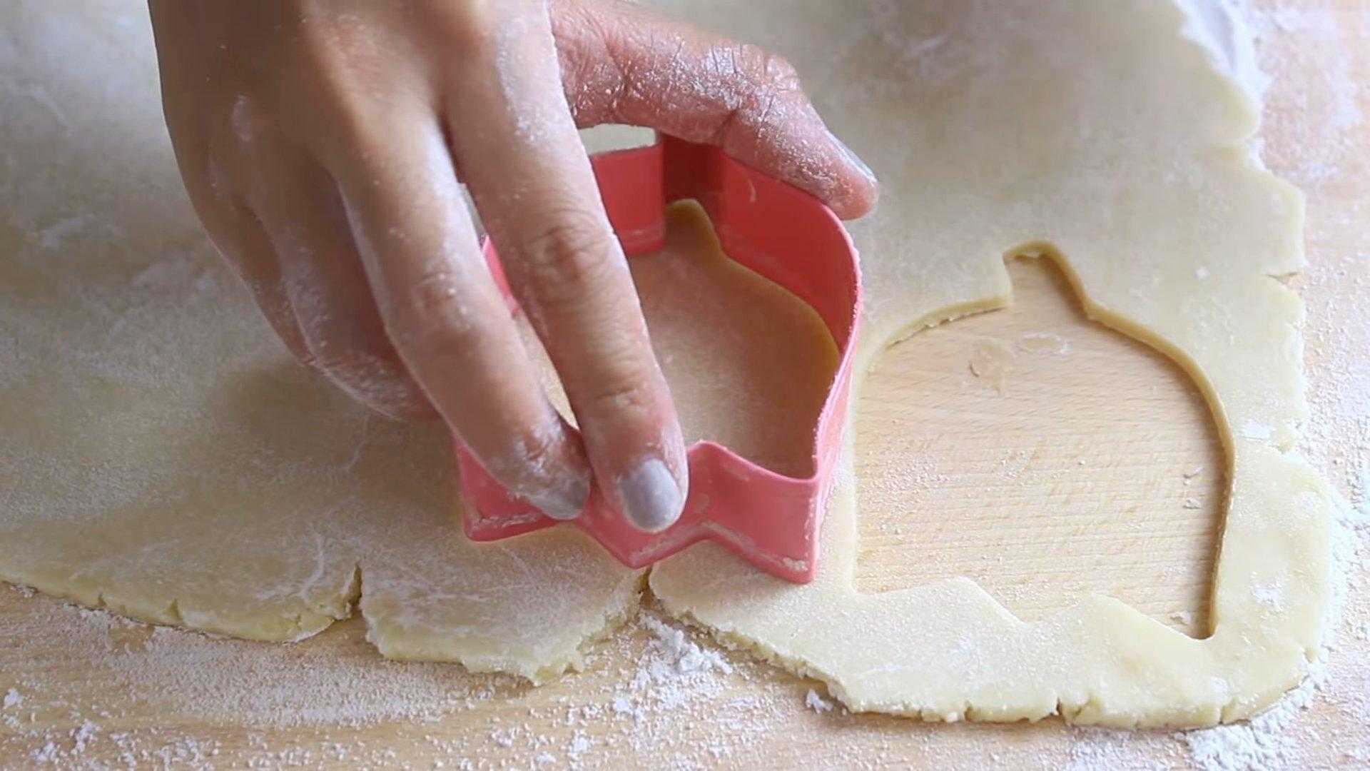 - Тесто раскатайте в тонкий пласт и фигурками (ведьма, звезда, месяц, привидение) выдавите печенье.
