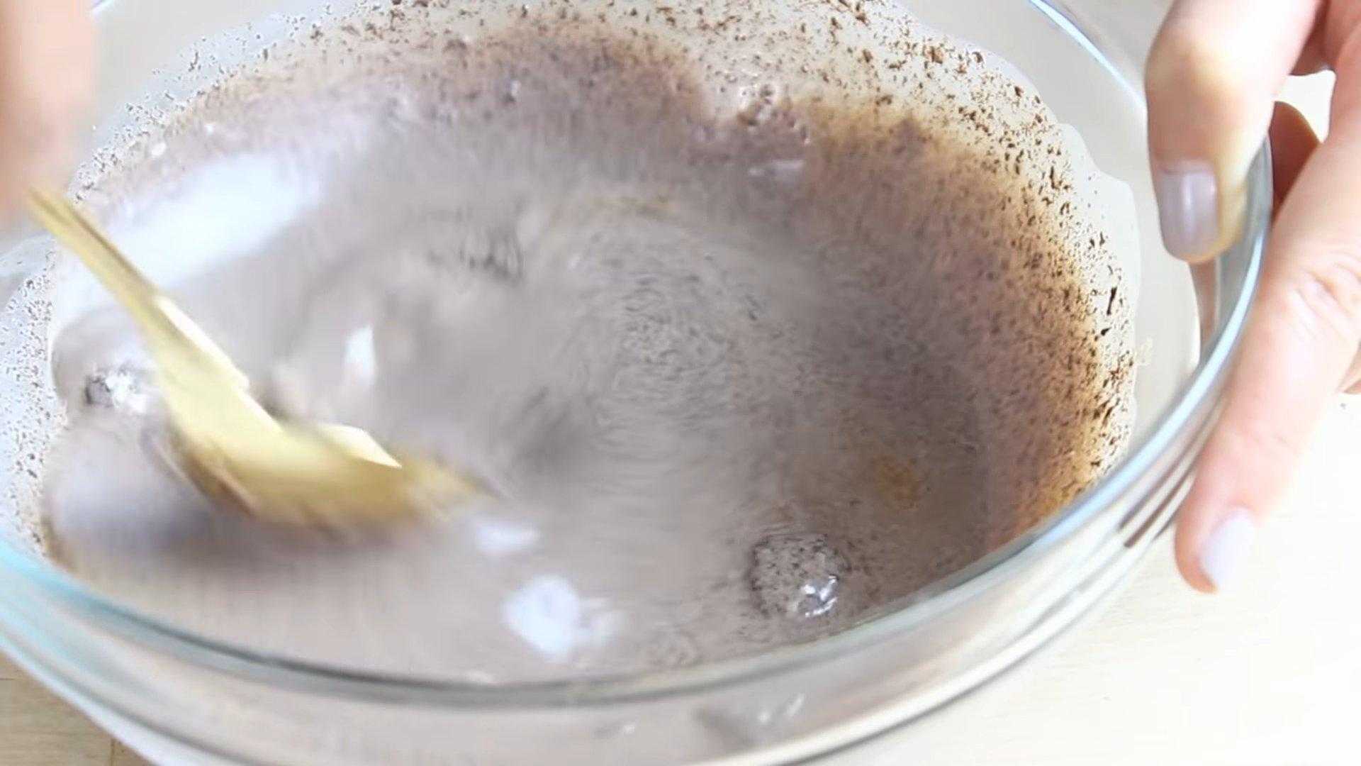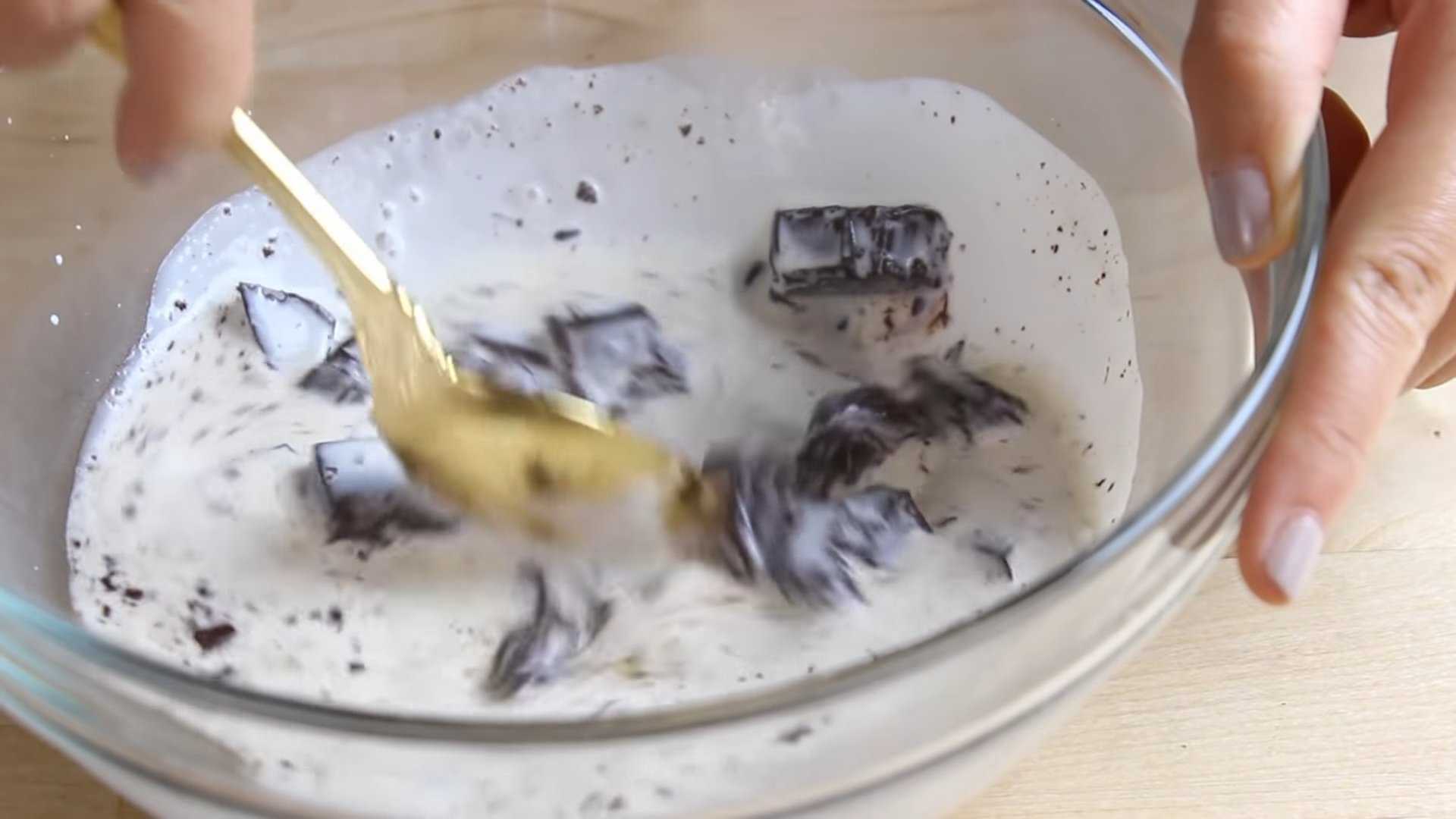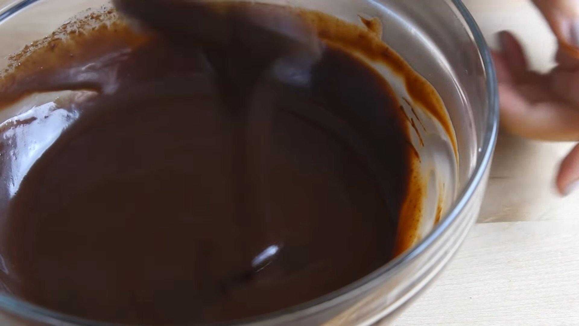 Для приготовления шоколадной подложки смешиваем в глубокой емкости кусочки шоколада, сливки и рассыпной эспрессо. Мешаем смесь ложкой до тех пор, пока шоколад полностью не растворится, а масса приобретет темно-коричневый цвет. Отправляем смесь в холодильник на 10 минут.