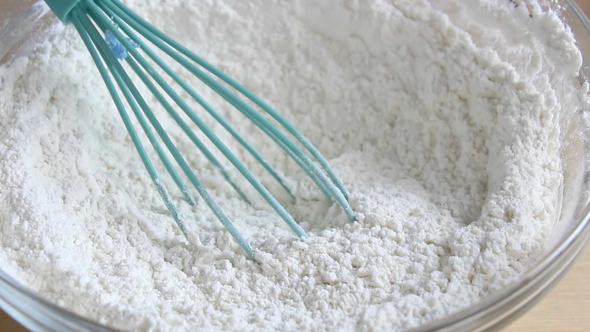 В отдельной емкости смешиваем муку, разрыхлитель и соль. Перемешиваем все венчиком.