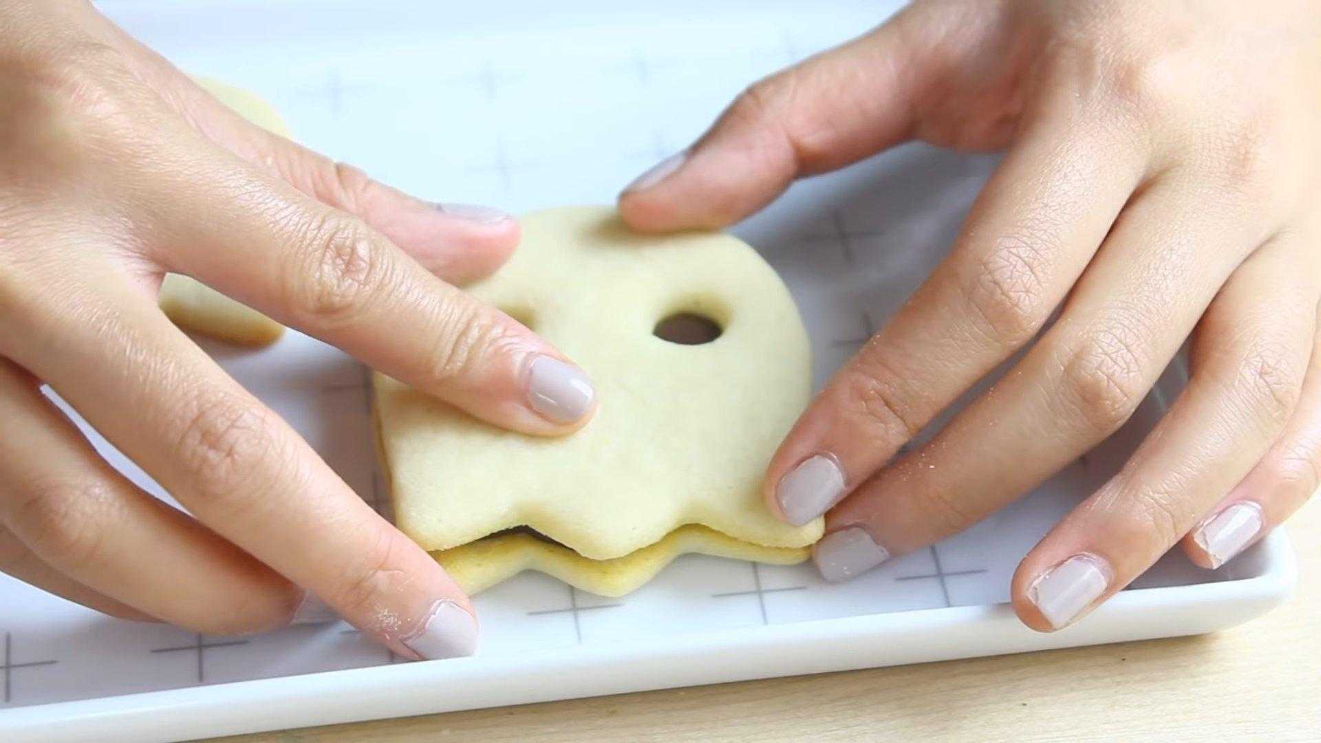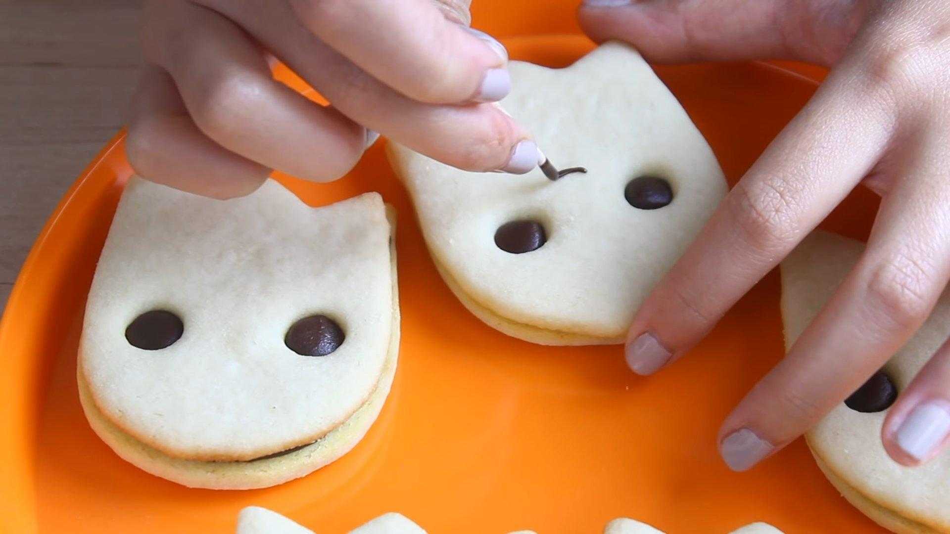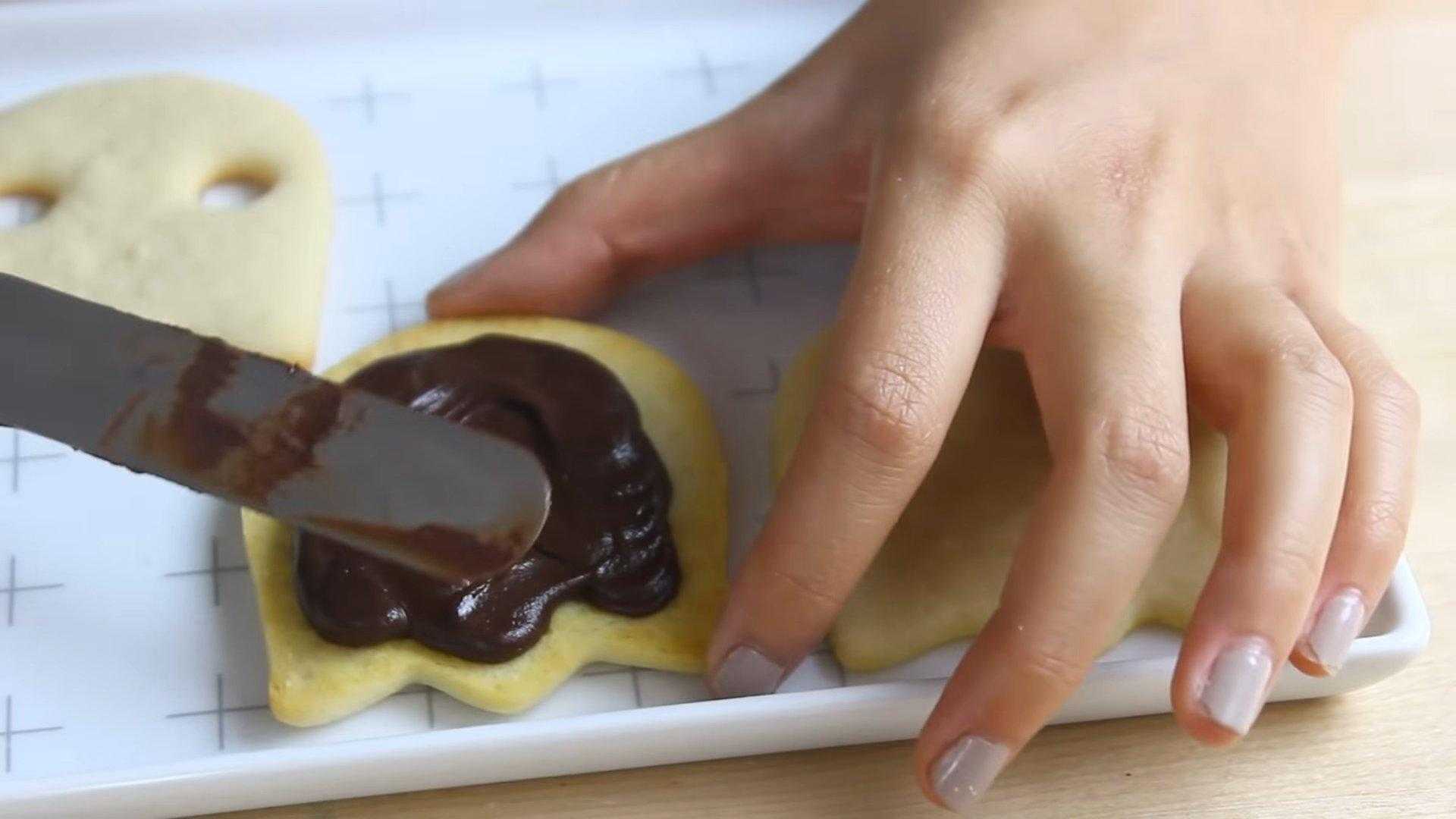 Декорируем печенье с помощью шоколадной смеси. На заднюю сторону выливаем шоколад, а сверху накрываем его стороной с «глазами». Добавляем элементы оставшиеся элементы – рот, глазные точки.