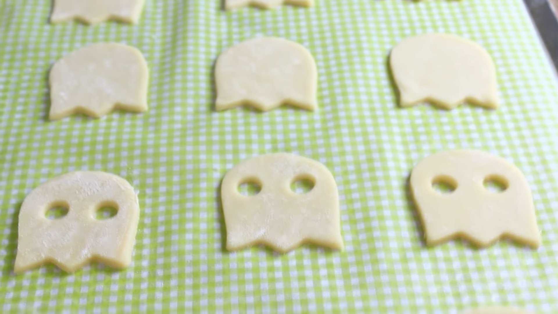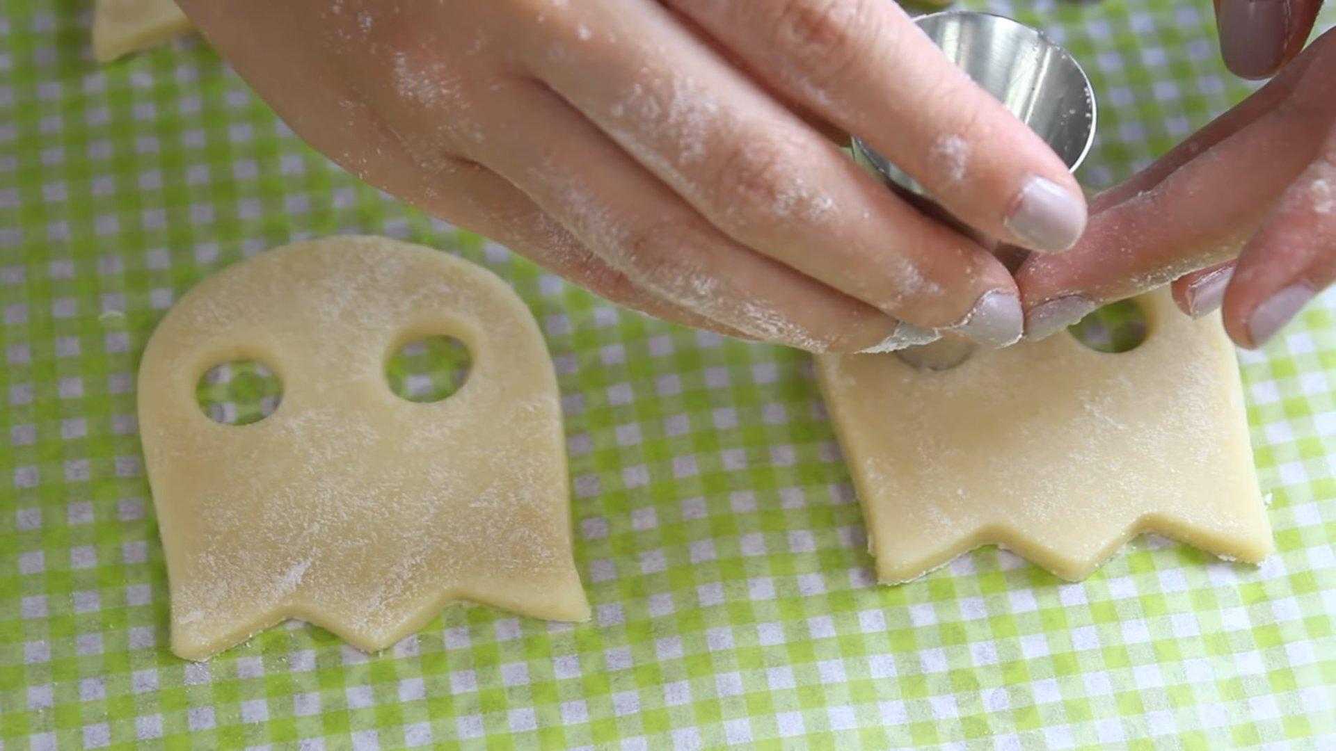 С помощью специальной формы вырезаем из теста призраков и делаем уголком «глаза».