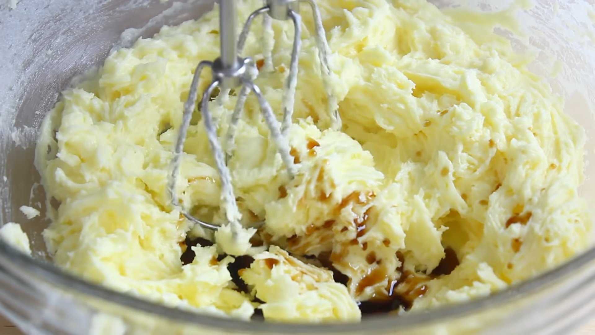 В глубокой емкости смешиваем сливочное масло, сахар, яйца и экстракт ванили. После добавления каждого ингредиента тщательно вымешиваем смесь миксером.