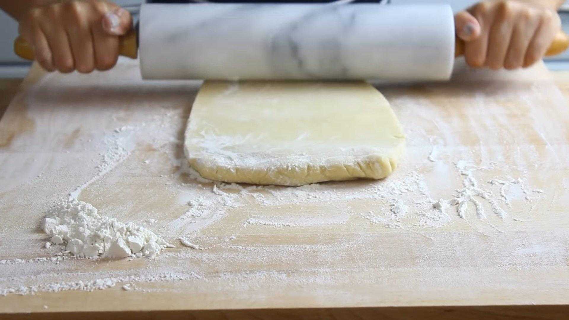 Раскатываем затвердевшее тесто скалкой до приблизительной толщины в 0,5 сантиметра.