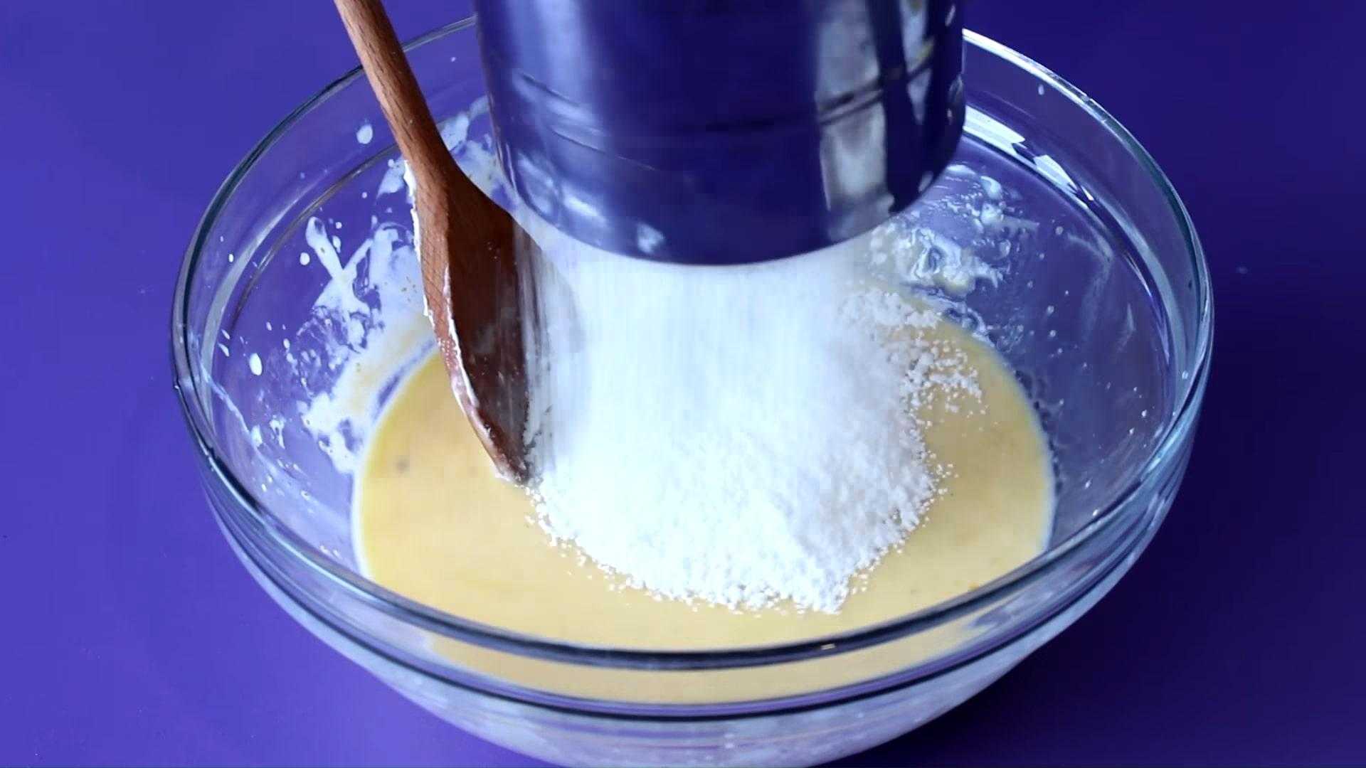 - Муку смешайте с разрыхлителем и ванилином. По полстакана добавляйте к остальному тесту.