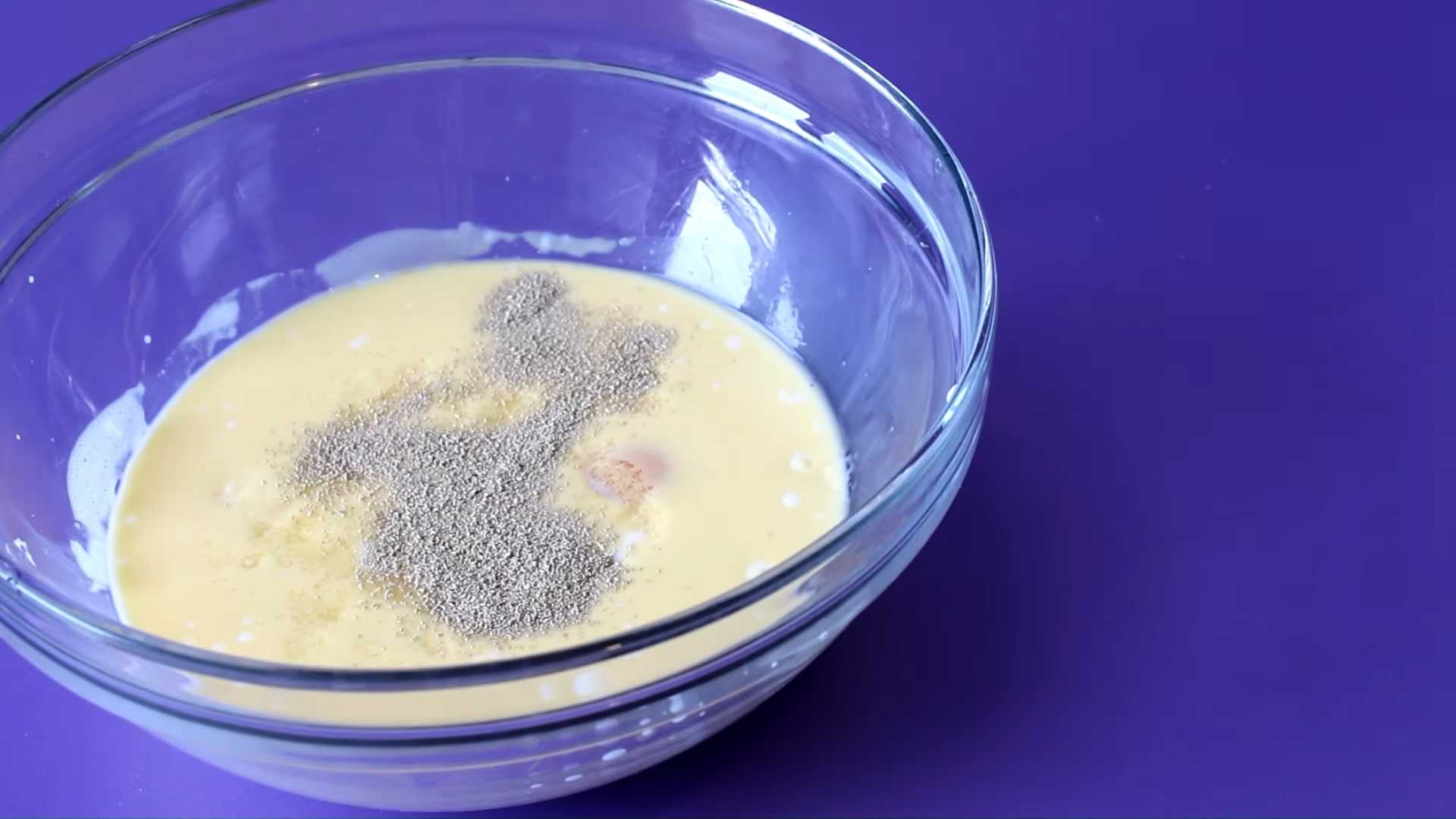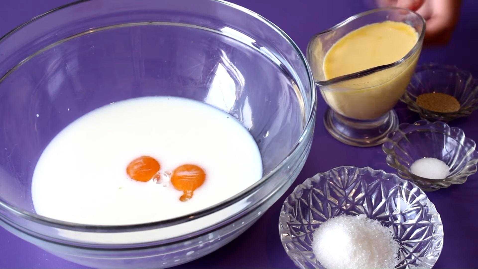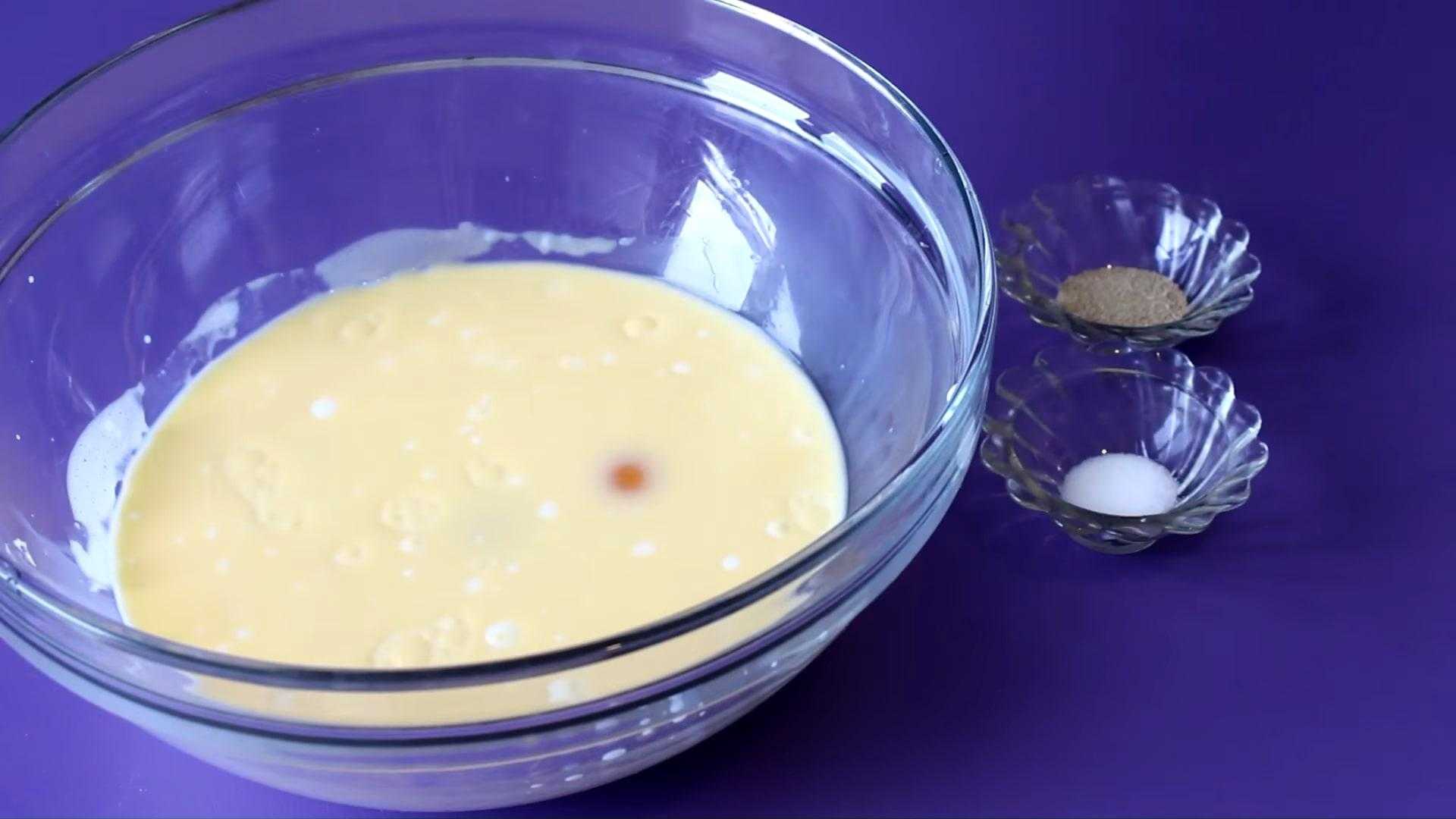 1. 100 мл молока смешайте с яйцами и мукой и взбейте до единообразного состояния.