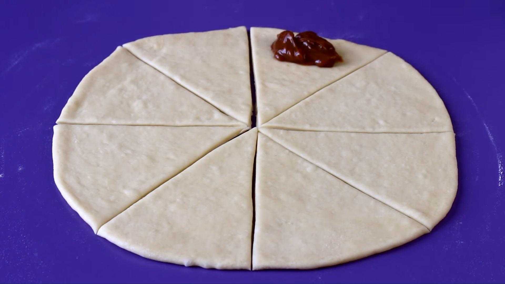 Разделяем пласт на 8 треугольников. Выкладываем сгущенку на широкий край.