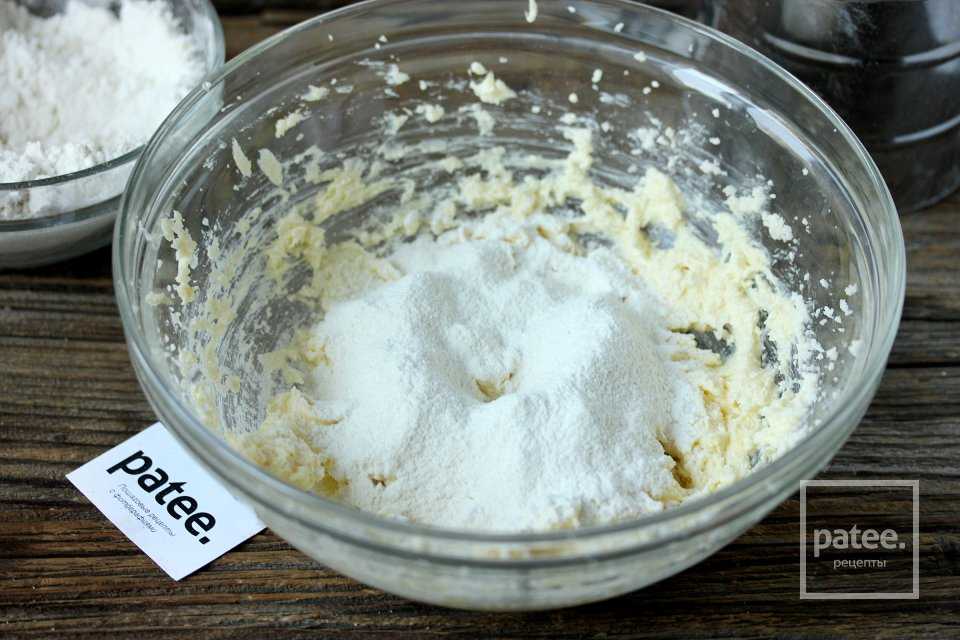 Пшеничную муку соединяем с половиной чайной ложки разрыхлителя и частями всыпаем в масляно-яичную смесь.