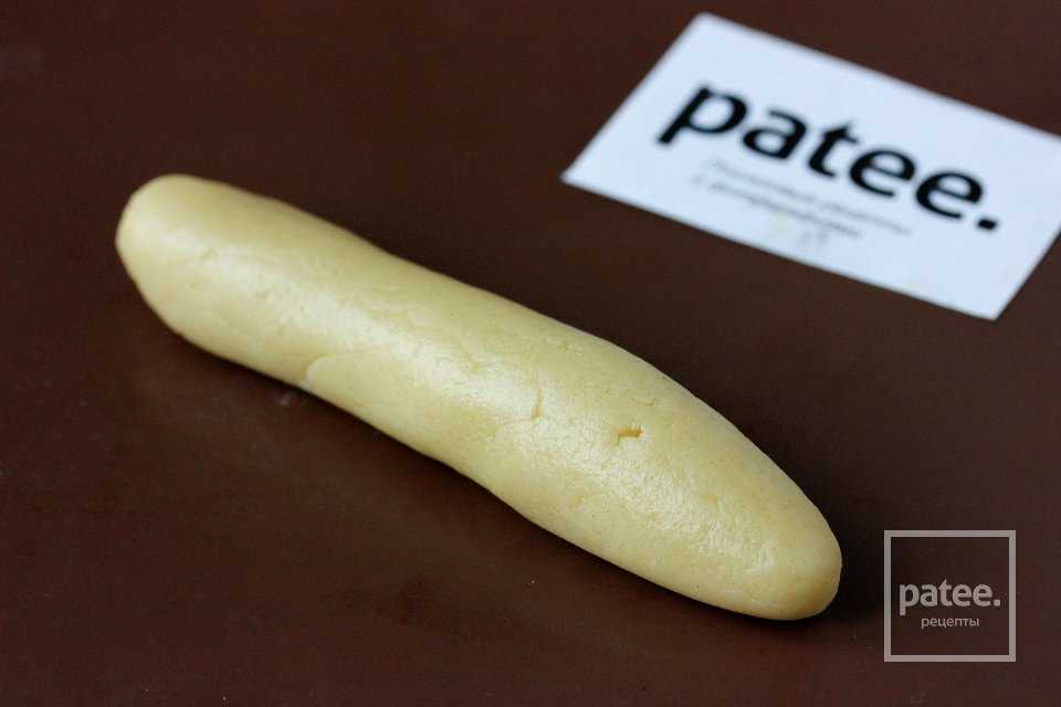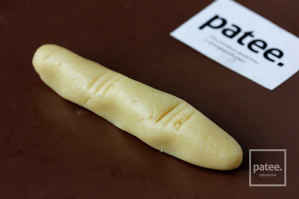Через указанное время продолжим приготовление печенья на Хэллоуин. Весь объём теста разделяем “на глаз” на 15 примерно равных частей. Берём один кусочек теста и придаём ему форму тонкой колбаски. Слегка надавив на эту колбасу по бокам, имитируем человеческий палец.