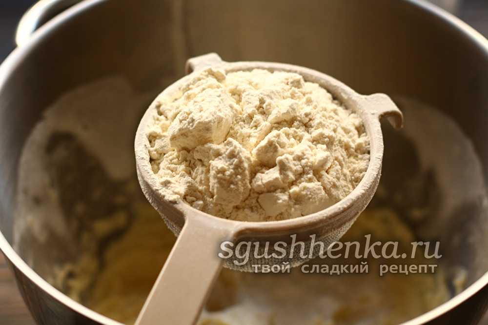 В смесь добавьте ванилин, разрыхлитель и начинайте небольшими порциями вводить муку.