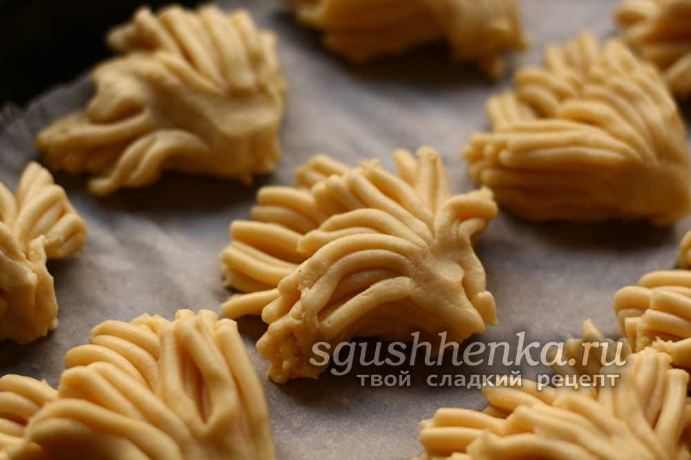 Выложите печенье хризантемы из детства ((или печенье через мясорубку) на противень. Не забудьте смазать его маслом (подсолнечным) или постелить пергамент на дно. Сверху выпечку также можно смазать небольшим количеством масла (сливочным или подсолнечным) или, как альтернатива, яичным желтком, чтобы придать насыщенный цвет.