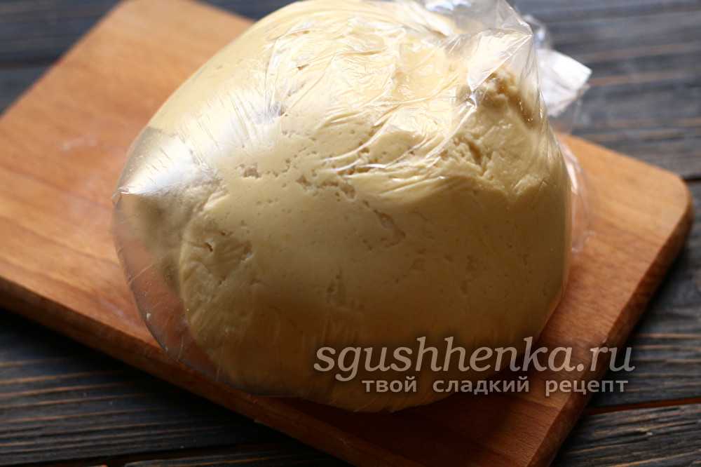Полученное тесто нужно завернуть в пищевую пленку либо полиэтиленовый пакет, поставить в холодильник на 20 минут. В течение этого времени заготовка «отдохнет» и будет удобна в приготовлении.