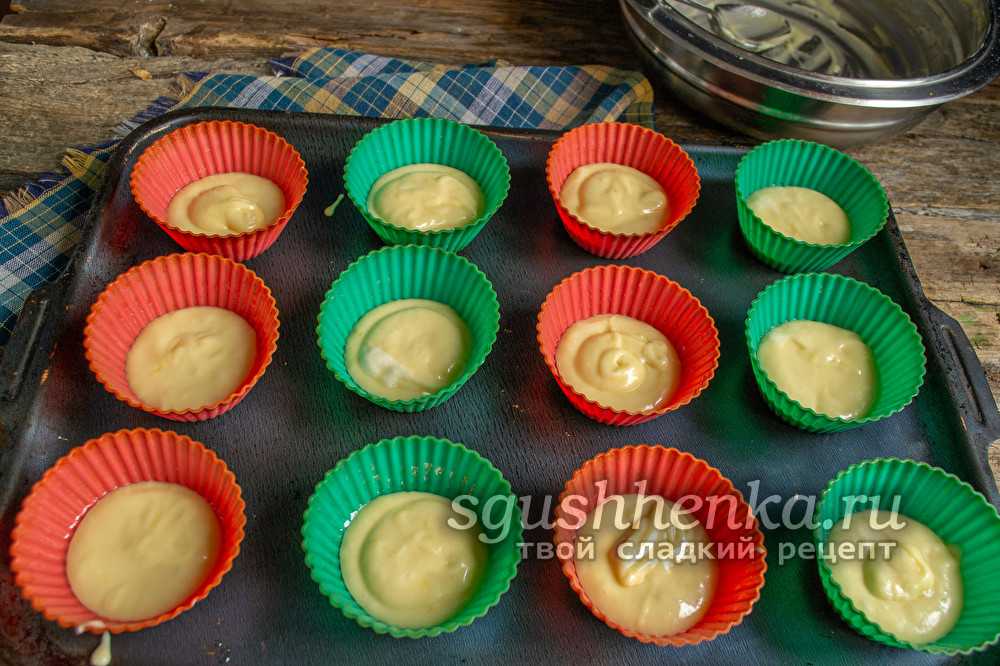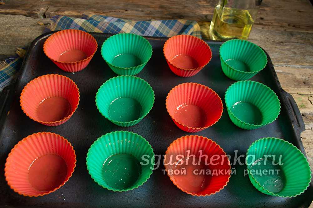 Силиконовые формы для кексов (маффинов) смазать каплей растительного масла. Выставить на широкий плоский противень. Разогреть до 175°C духовку.