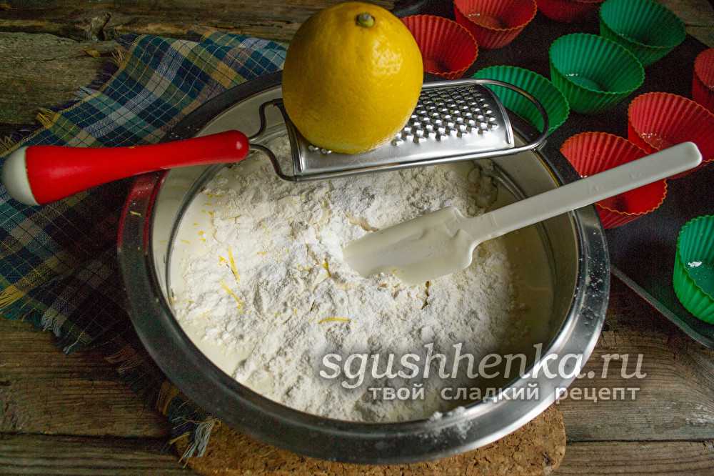 Лимон вымыть (можно с содой), обдать кипятком, вытереть насухо. Натереть на мелкой терке цедру (только желтый слой). Добавить в тесто. Смешать.