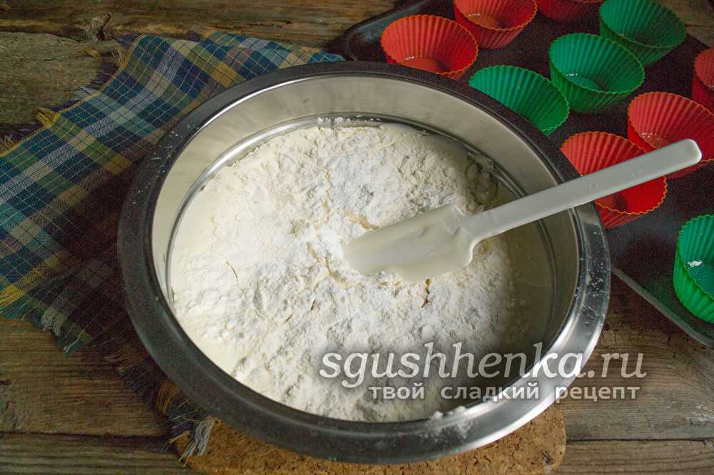 Пшеничную муку просейте через сито и соедините с чайной ложкой пекарского порошка. Порционно вводите муку к остальным ингредиентам до тех пор, пока не замесите тесто по консистенции похожее на пластилин. Оно не должно быть слишком густым, оно должно быть пластичным.