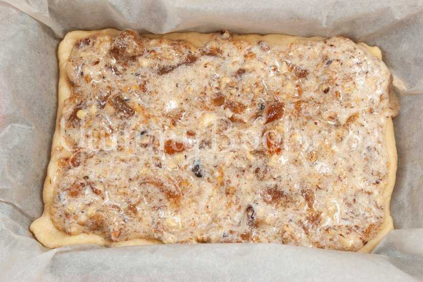 Шаг 6. Тоненько раскатать один из кусков теста и переложить приготовленный пласт в форму самого подходящего размера, затем отделить половину орехово-абрикосовой начинки и равномерным слоем распределить ее на заготовке.