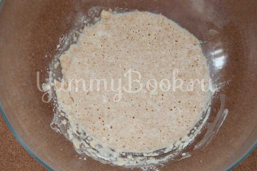 Шаг 2. Добавить в посуду с дрожжевой смесью пшеничную муку, затем еще раз тщательно перемешать все, чтобы не осталось мучных комочков и минут на пятнадцать оставить в теплом месте.