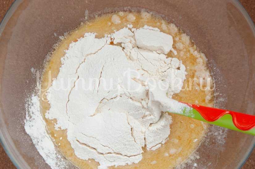 3. Добавляем часть муки, не перемешивая, высыпаем соду, затем насыпаем вторую часть муки, ждем пару секунд, затем перемешиваем составляющие. (Тем самым мы гасим соду мукой).
