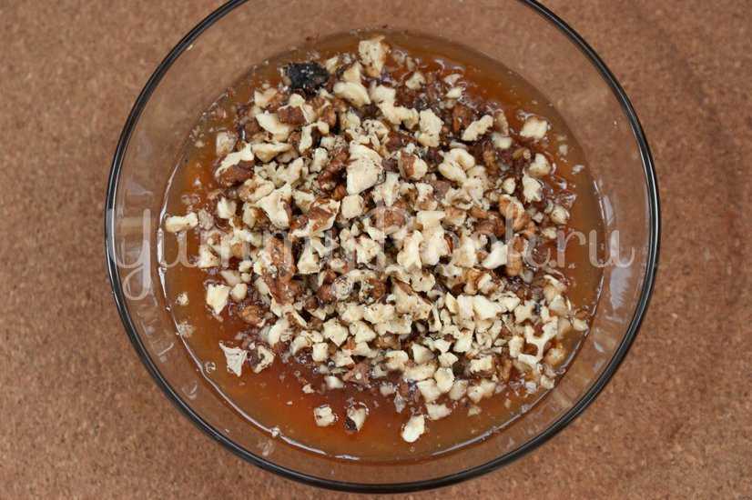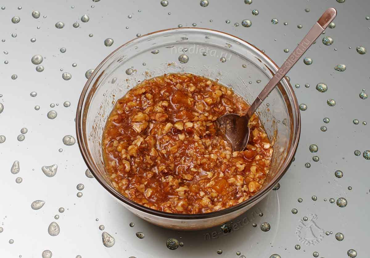 6. В абрикосовое повидло добавить измельченные орехи, яичный белок, сахар по желанию (я не добавляла).