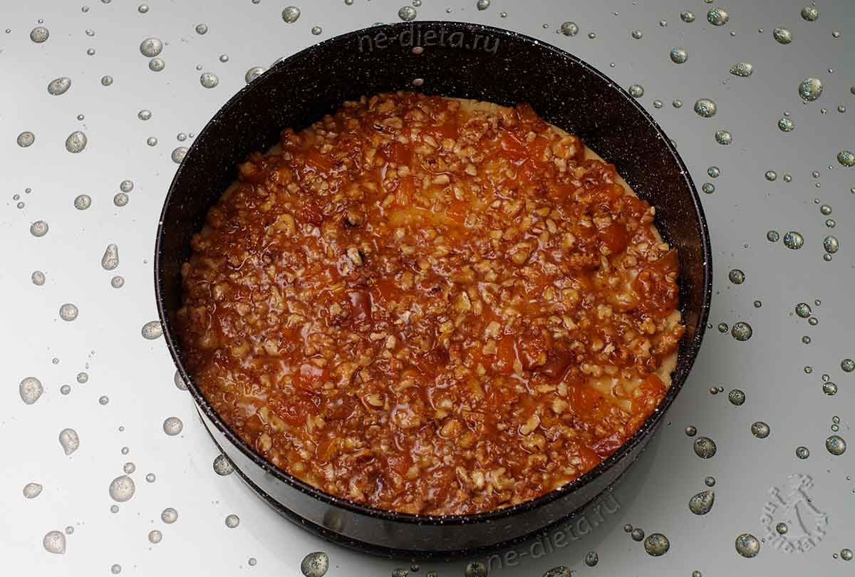 Тесто раскатать, сверху намазать абрикосовое варенье, посыпать орехами.