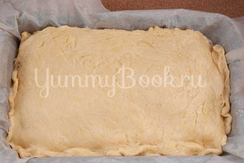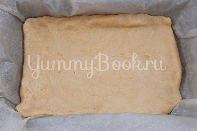 5. Раскатать одну часть теста в пласт толщиной, примерно, 1,5 см. и переложить его на выстеленный пергаментом противень или в форму. У меня форма размером 21х27см.