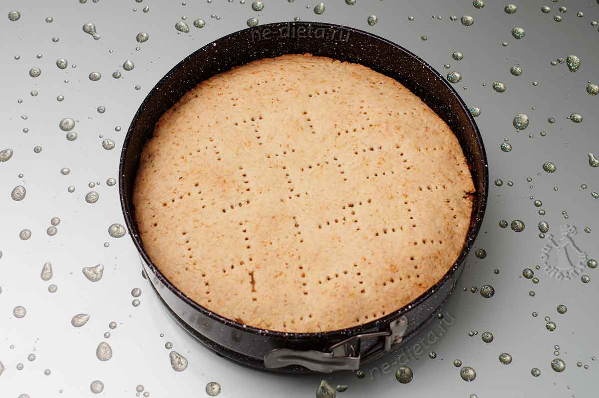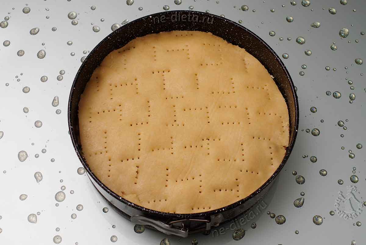 Как приготовить: готовим тесто, как в предыдущем рецепте, раскатываем его на 1 см, застилаем дно формы для чизкейка, сформировав при этом бортики высотой 5 см. Накрываем форму пищевой пленкой и прячем в холодильник.
