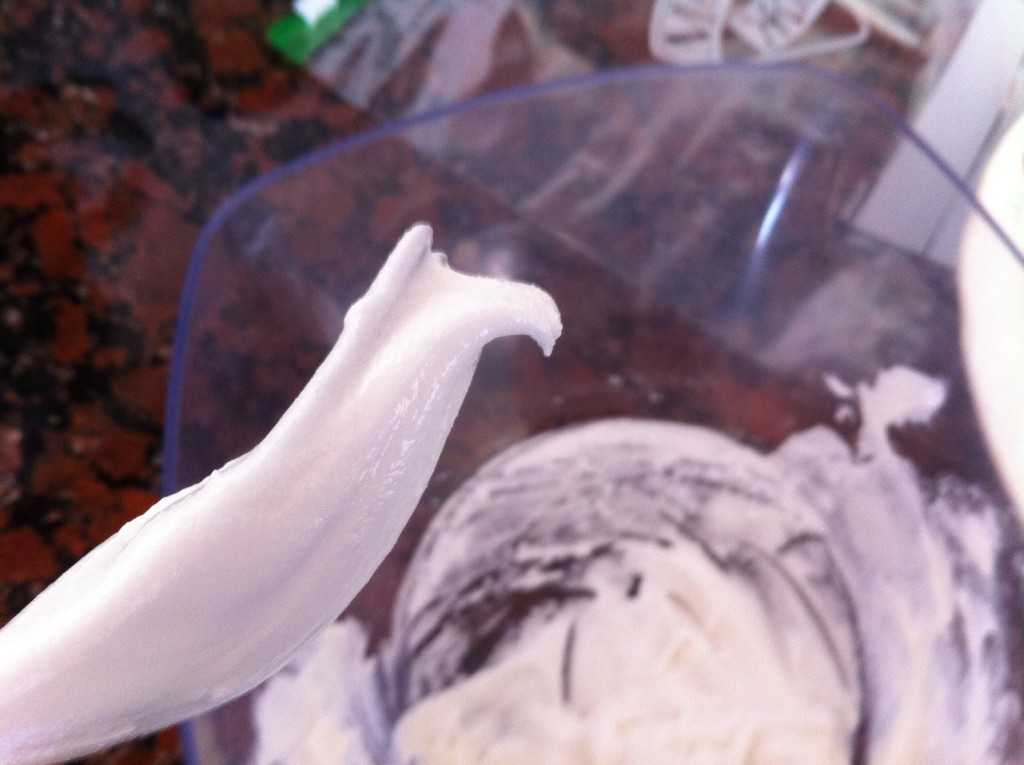 В сухой посуде взбейте венчиком охлажденный белок и постепенно добавляйте к нему просеянную(!) сахарную пудру, когда белок станет плотным, как на фото добавьте 0,5 чайной ложки лимонного сока или лимонной кислоты на кончике ножа и снова все перемешайте.