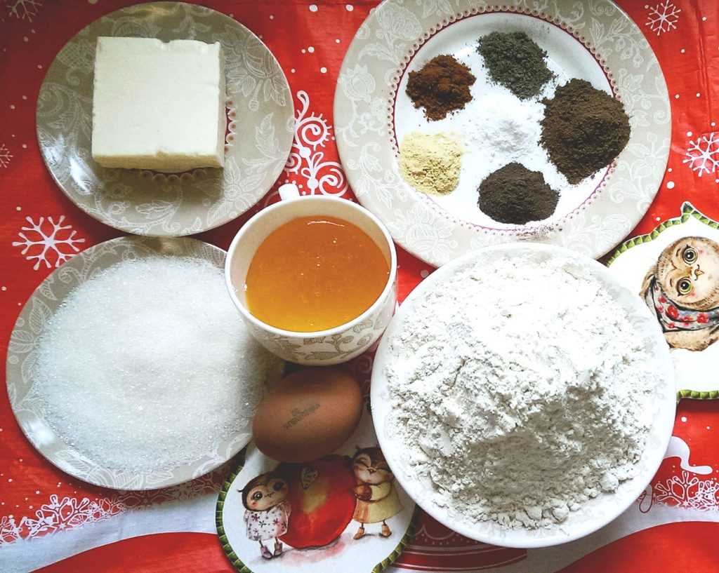 Подогрейте мед со сливочным маслом, всыпьте сахар. Последний должен раствориться. Остудите до нормальной температуры. С содержимым смешайте яйцо и букет приправ. Растворите соду и разрыхлитель в воде, вылейте к оставшимся ингредиентам и перемешайте. Заранее просеянную муку частями добавляйте к составляющим и месите тесто до тех пор, пока не перестанет быть липким. Оно должно побыть в холодильнике 1.5-2 ч. Выпекаем при 180º 10 минут. Наслаждайтесь вкусом и ароматом!