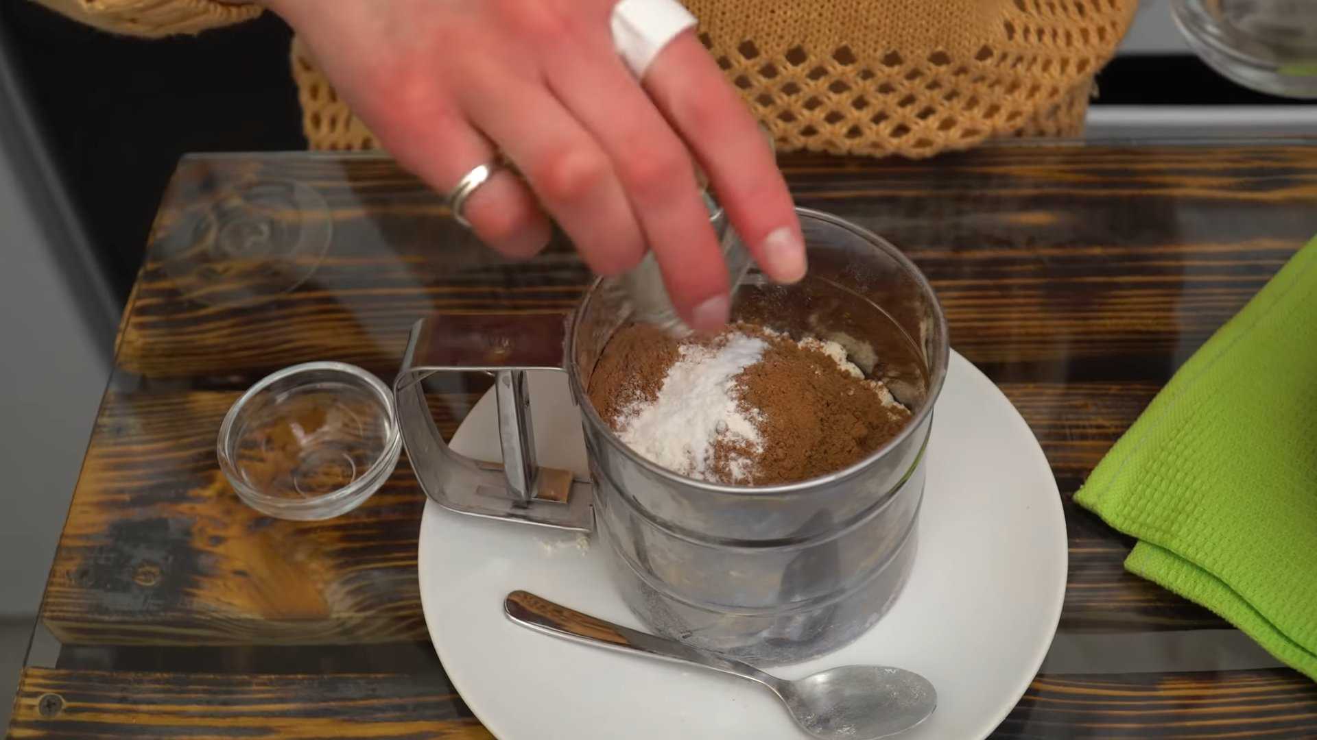 - Засыпать в одну емкость какао, корицу, муку, соду, мускатный орех, соль, перемешать.