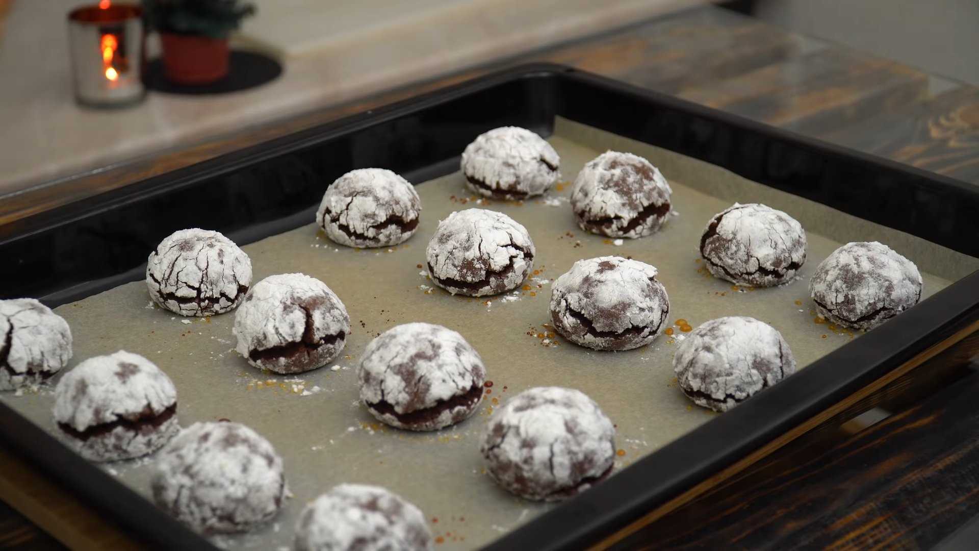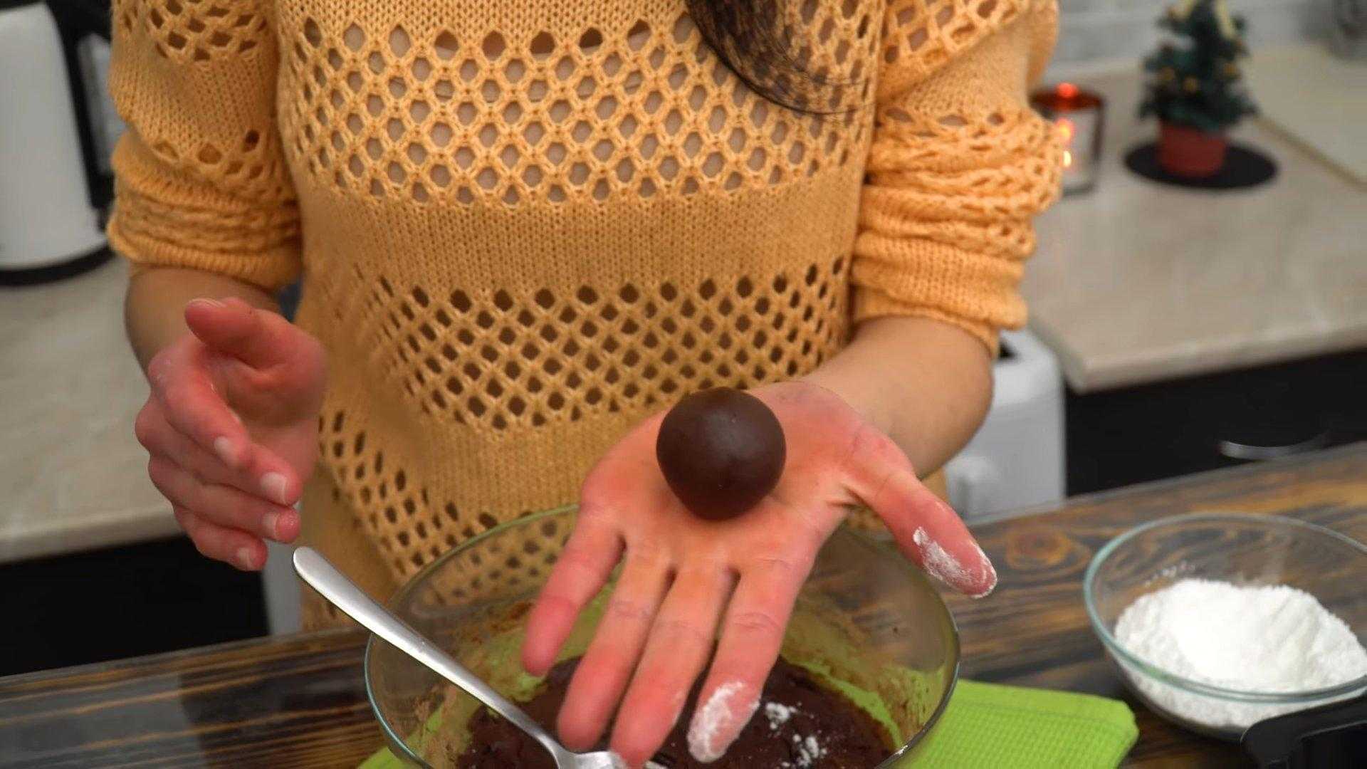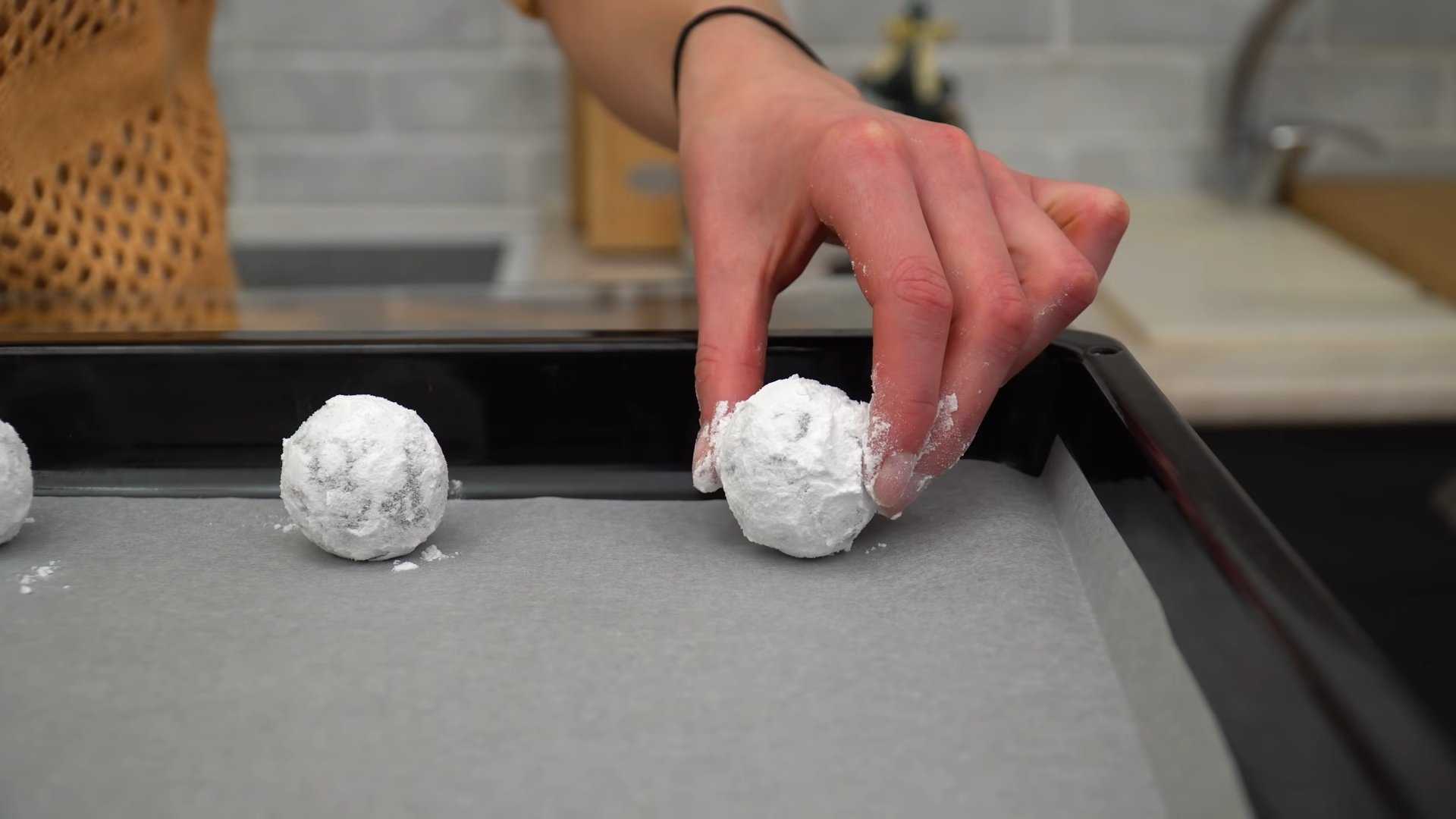 - Наберите чайной ложкой тесто, а потом скатайте его в руках в шарик. Обваляйте шарик в пудре и выложите на подготовленный противень. Сформируйте так все печенья.