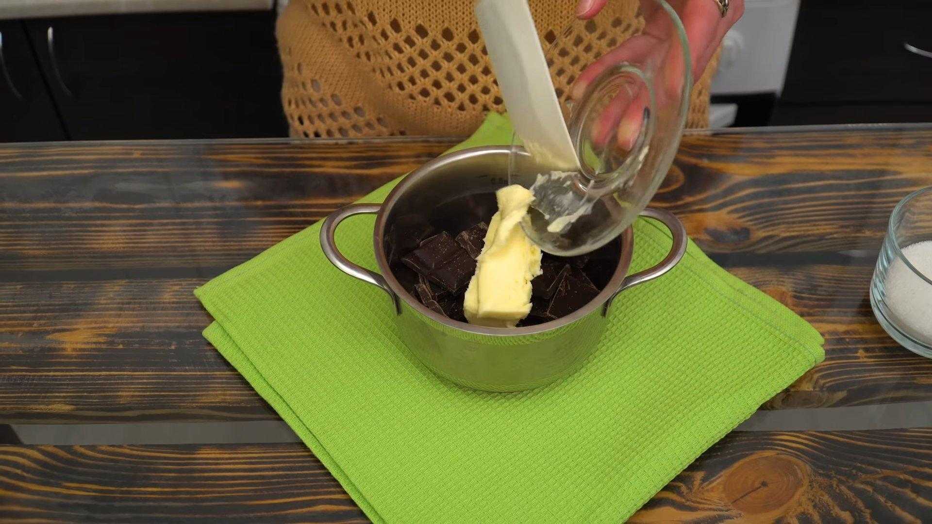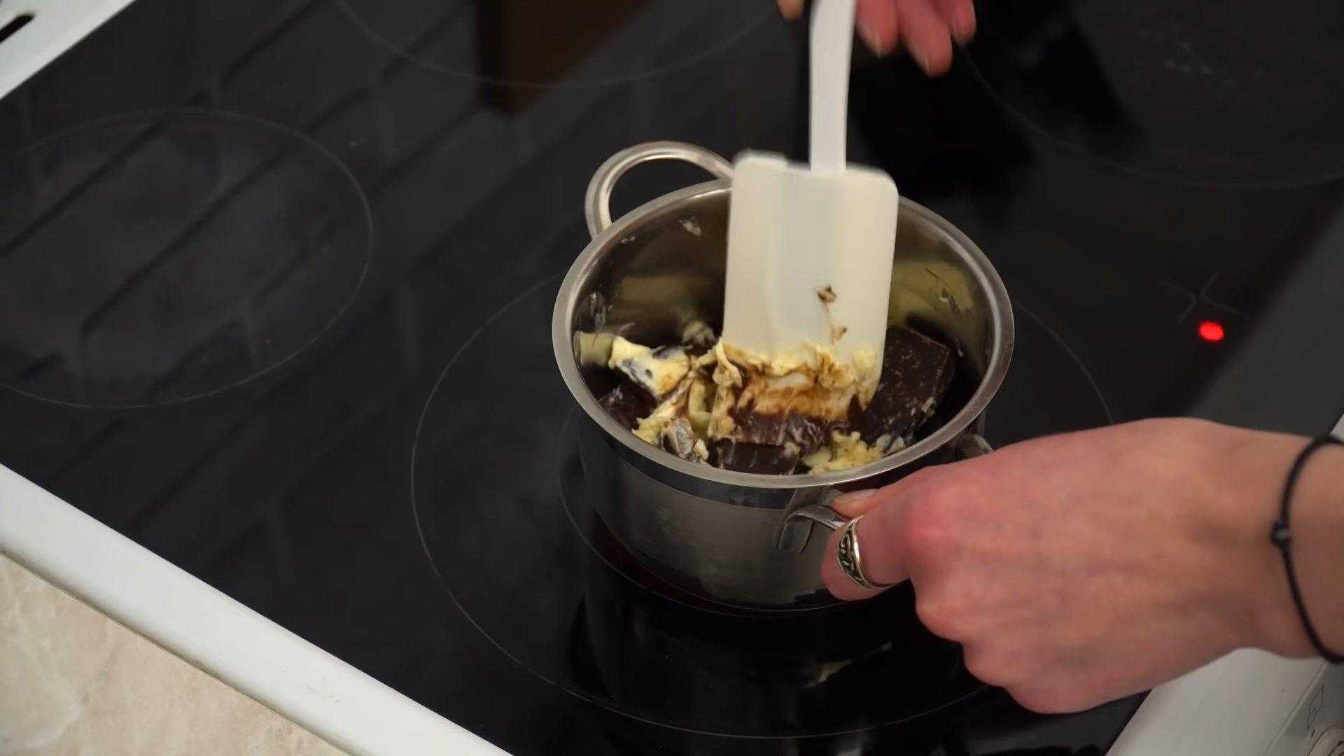 Сливочное масло (85 г), порошок какао (1 ст. л) положите в сотейник или небольшую кастрюльку и поставьте на медленный огонь. Дайте маслу растаять.