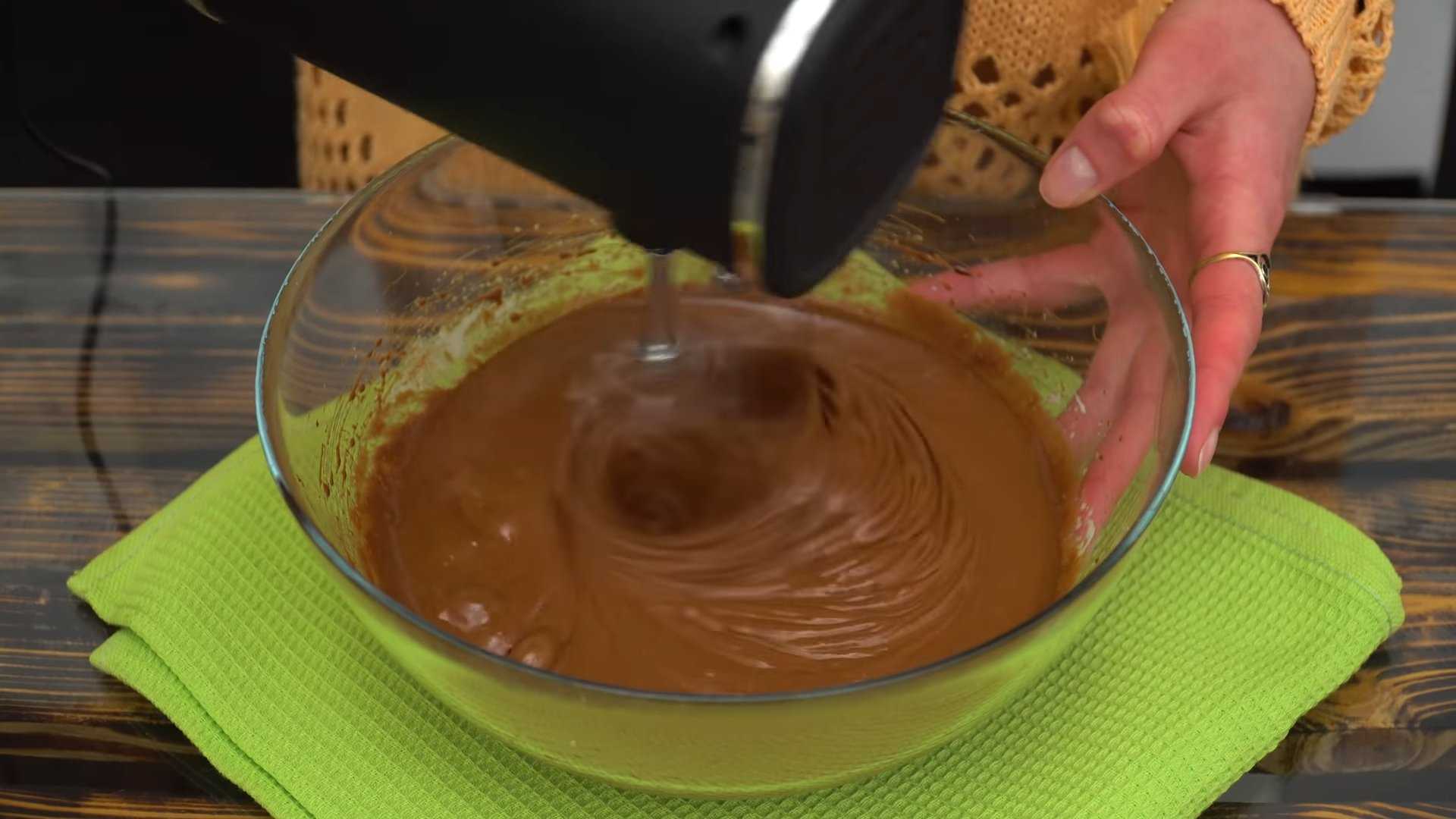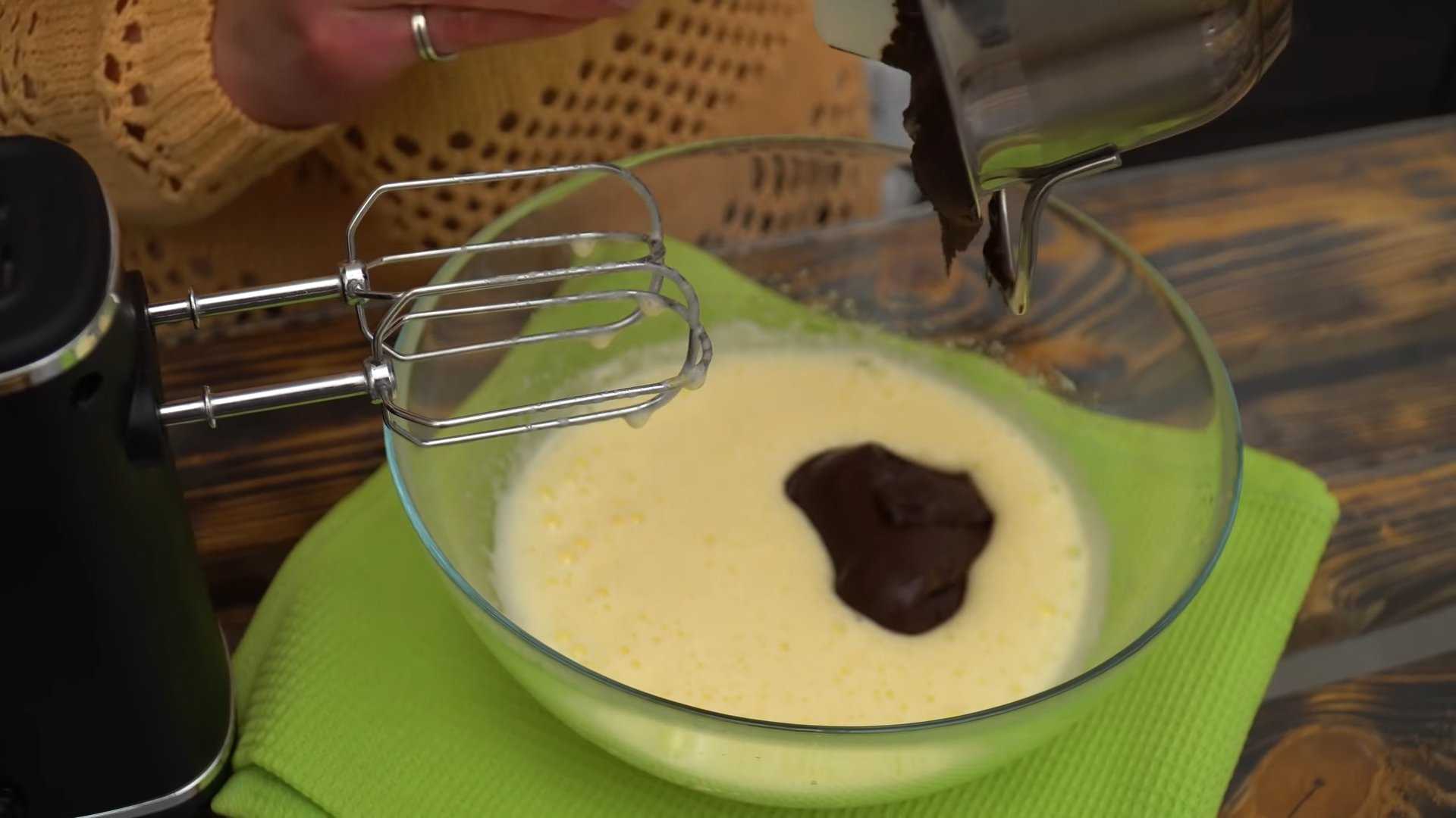 - Взбить отдельно масло, засыпав к нему сахар, затем разбить яйца, после чего перемешивать еще минуту. Уменьшив скорость прибора, добавить экстракт ванили и растопленный шоколад.