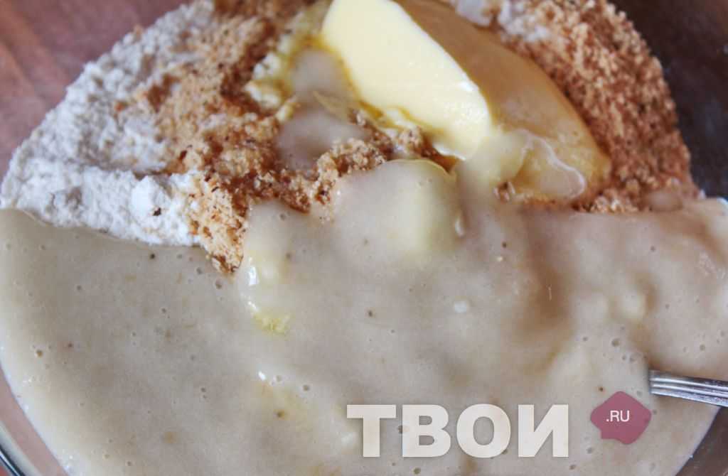 К сухой массе влить взбитые бананы и добавить размягченное сливочное масло. Замесить тесто.