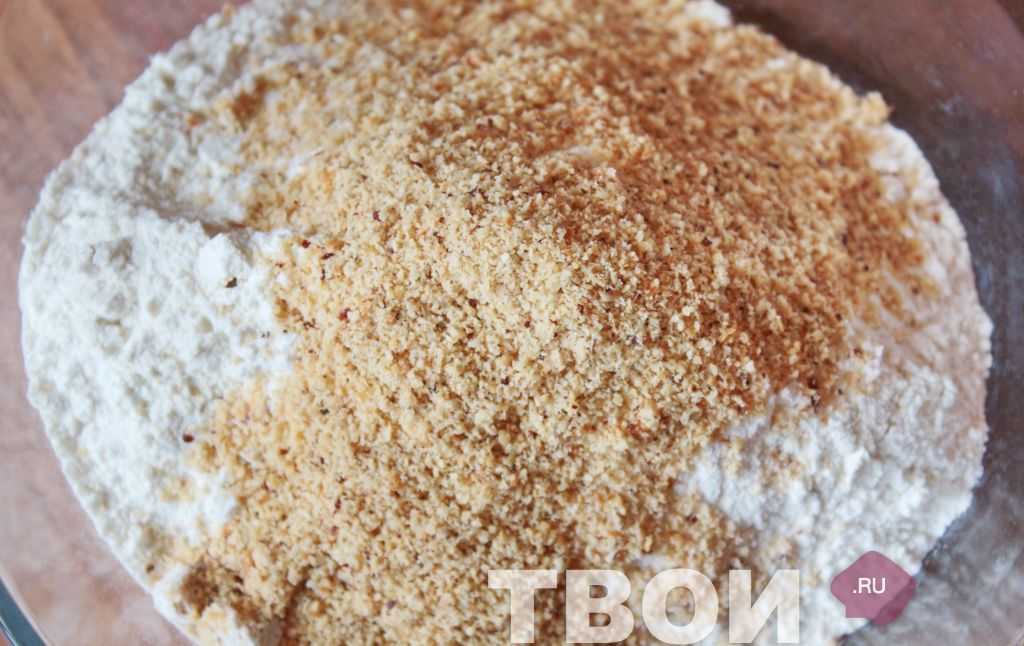 - Добавляем к крошке растопленное сливочное масло. Перемешиваем Вся крошка должна пропитаться маслом.