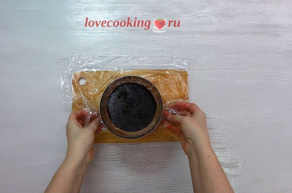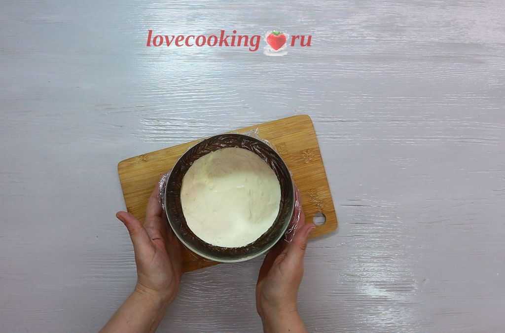 Помещаем заготовку в кольцо 14 см. Дно хорошо затягиваем пищевой плёнкой. Стенки формы можете застелить ацетатной плёнкой или тефлоновым ковриком.
