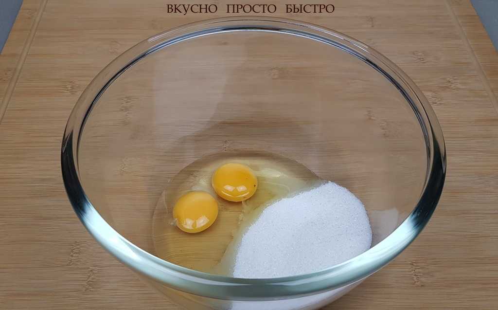 В отдельной емкости взбиваем яйца до состояния «мыльной пены». В этот момент не переставая взбивать добавляем к яйцам сахар. Продолжаем взбивать до получения пышной, белоснежной массы.