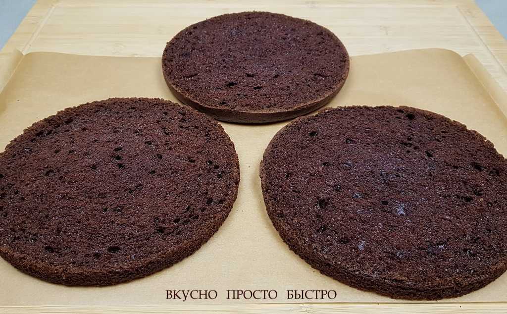 Готовому бисквиту даем остыть. После чего с помощью металлического кольца вырезаем коржи диаметром 12 см. Выбираем крем на свой вкус и собираем тортик.