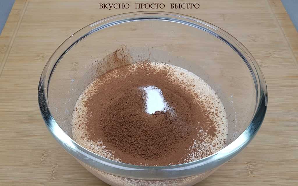 Муку, какао и разрыхлитель просеиваем через сито в глубокую емкость.
