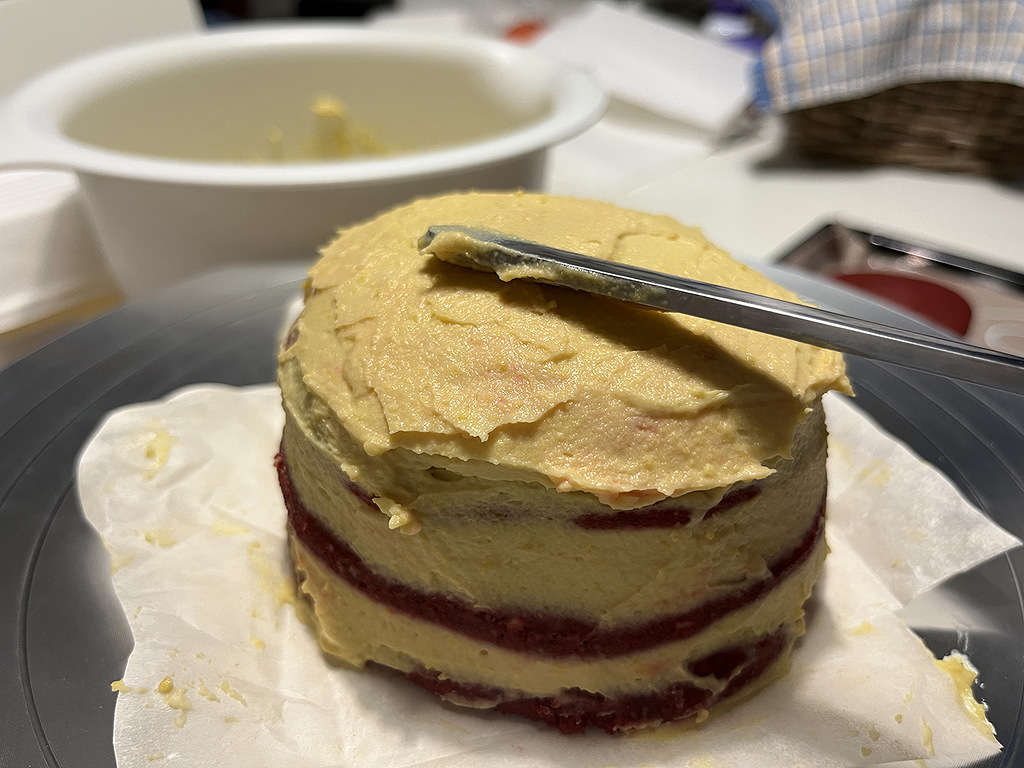 - Второй пропитанный корж помещают сверху и смазывают кремом для покрытия.