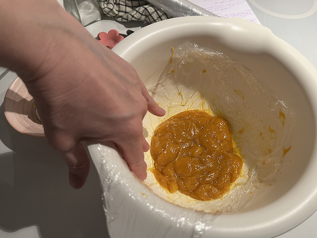 Полученную массу проложить плёнкой вконтакт — то есть, уложить плёнку прямо на поверхность массы, плюс плёнка должна плотно прилипать к бортикам посуды.