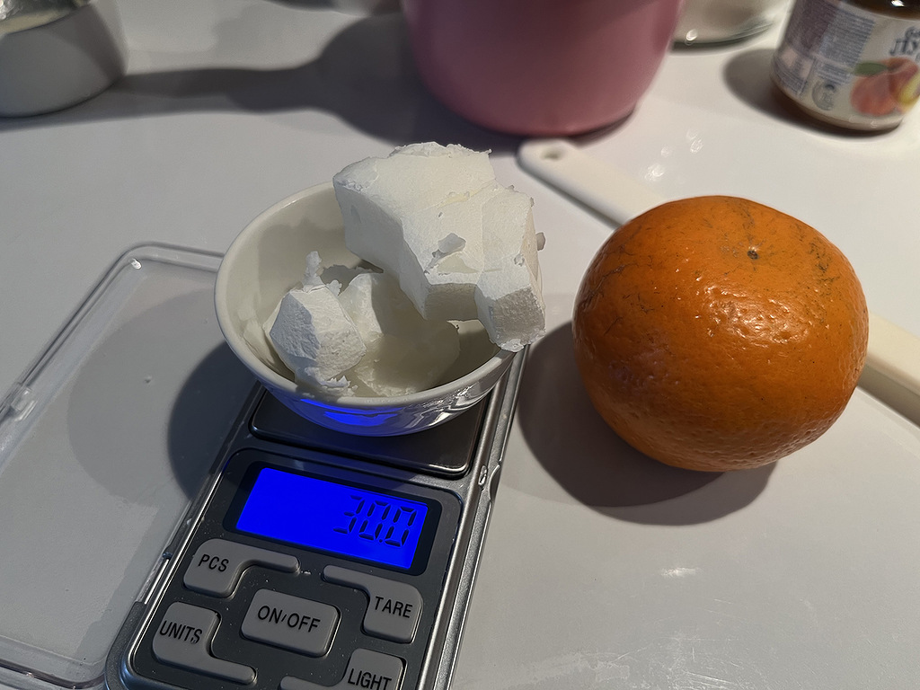 - 30 г кокосового масла — это кусочек размером с маленький, начинающий усыхать мандаринчик или 2.5 конфеты “Мишка косолапый” (это вторая часть масла, добавим её в смесь после активации крахмала).